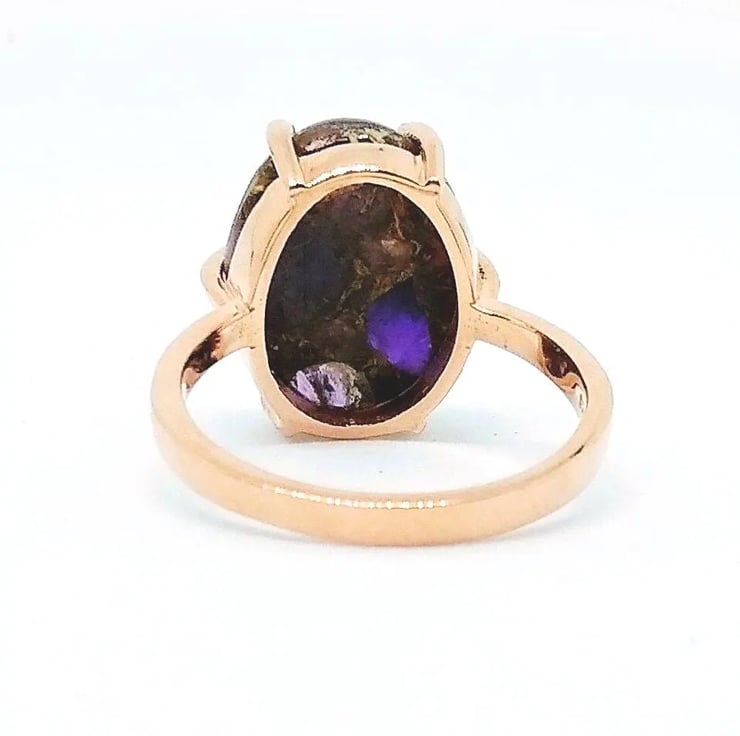 This is an unusual, stunning and eye catching Amethyst with Copper inclusions, known as a mohave gemstone. A large oval cabochon cut stone, size 16 x 12 mm, set into a rose gold plated sterling silver ring. An awesome ring that you really need to see up close and personal to discover the multitude of colours within the stone.