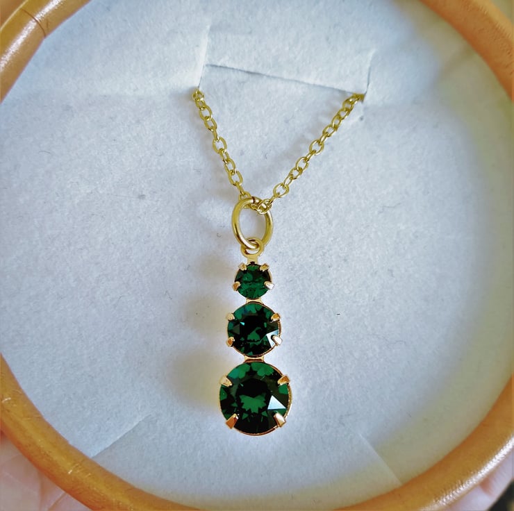 A sparkly Swarovski crystal pendant set with two changeable pendants and one gold plate 18 inch chain in each. Each set has a three crystal pendant size 25 x 8mm and a two crystal pendant 15 x 8mm with a gold tone backing.