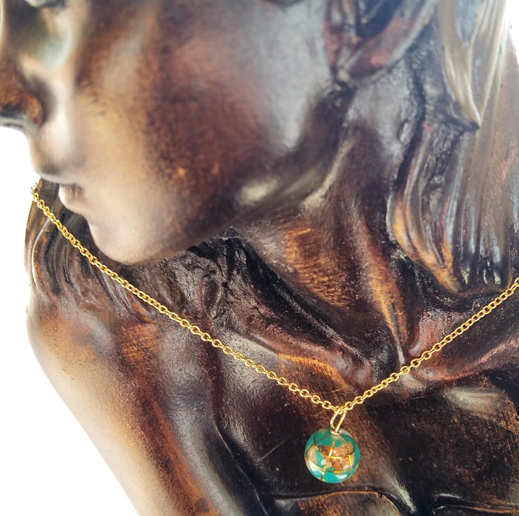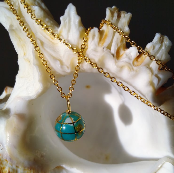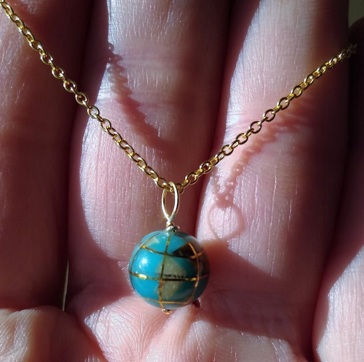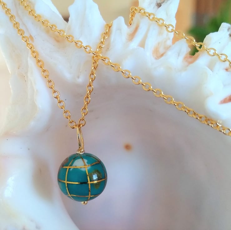 Stunning turquoise blue Malachite atlas globe skilfully inlaid with mother of pearl, and jaspers to represent the various continents of the world Suspended on a dainty gold plated 925 sterling silver 18 inch chain. The globe itself is 10 x 10mm.