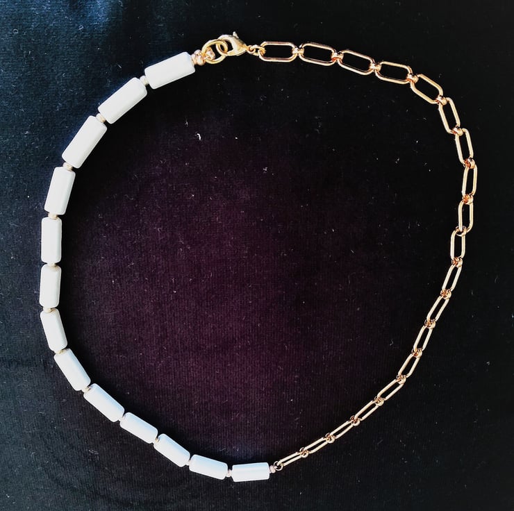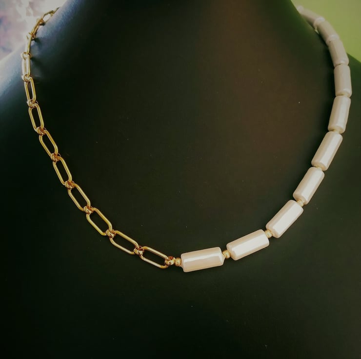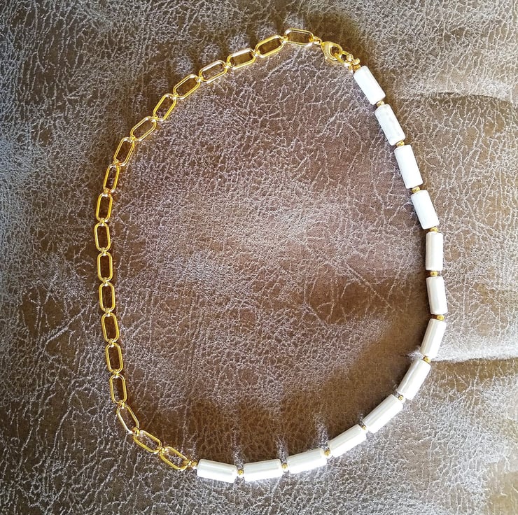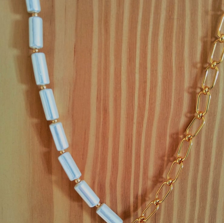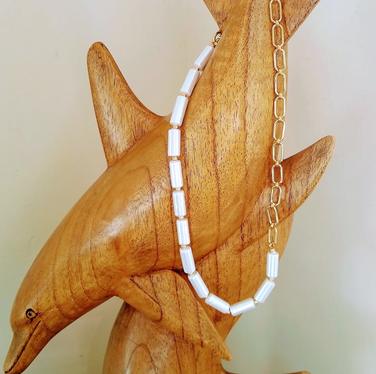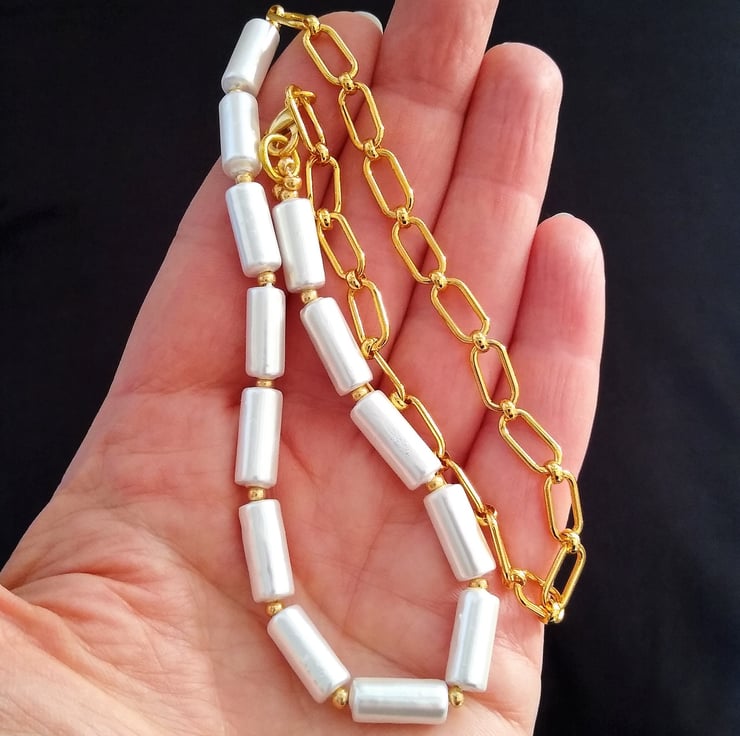 White Tube Shell Pearl Gold Plate Paperclip Chain Necklace 18 inch