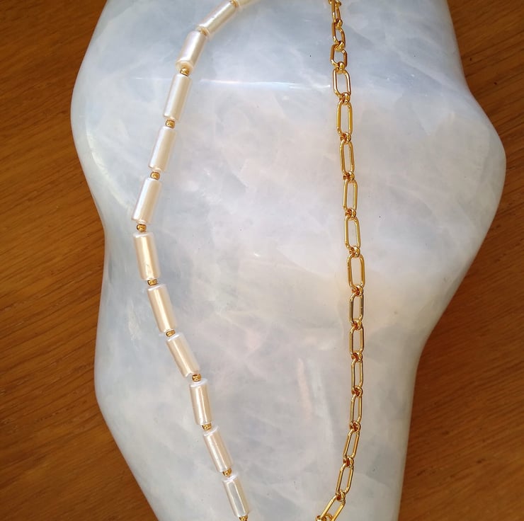 Modern stylish Shell Pearl asymmetric necklace with large paperlink style gold plate chain. Inspired by the Pandora pearl necklace.