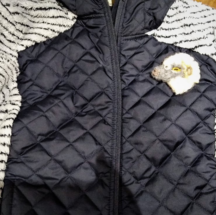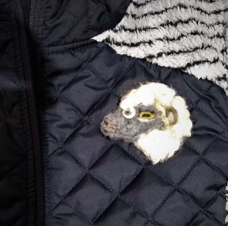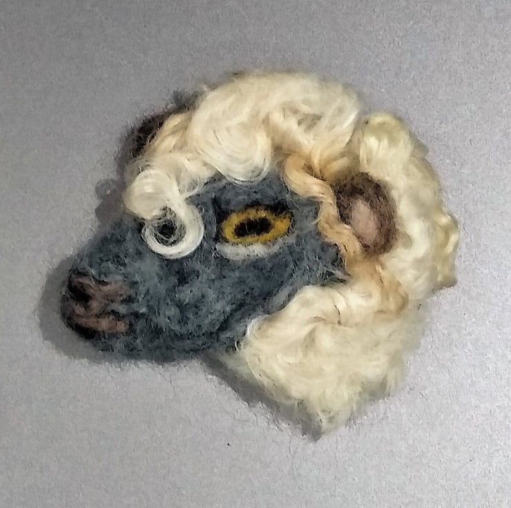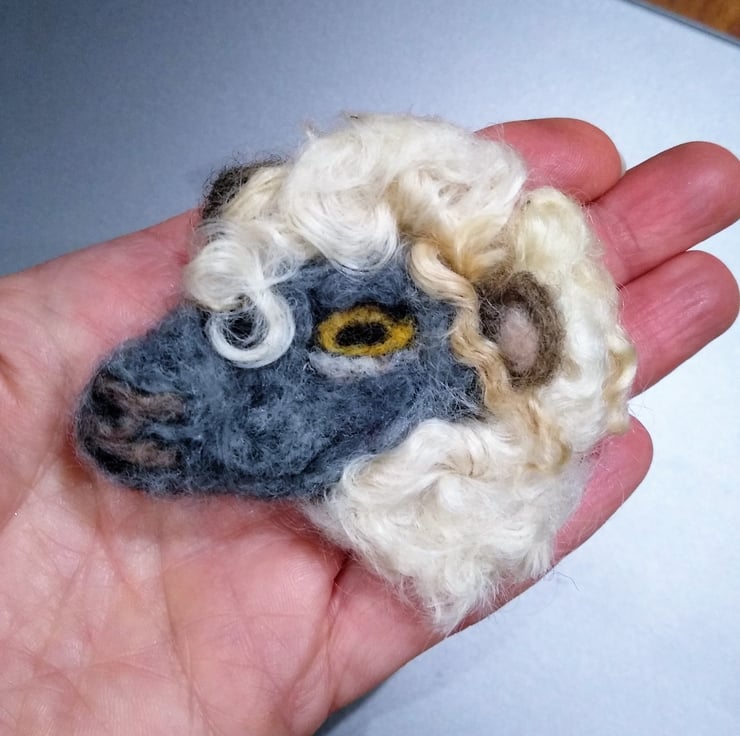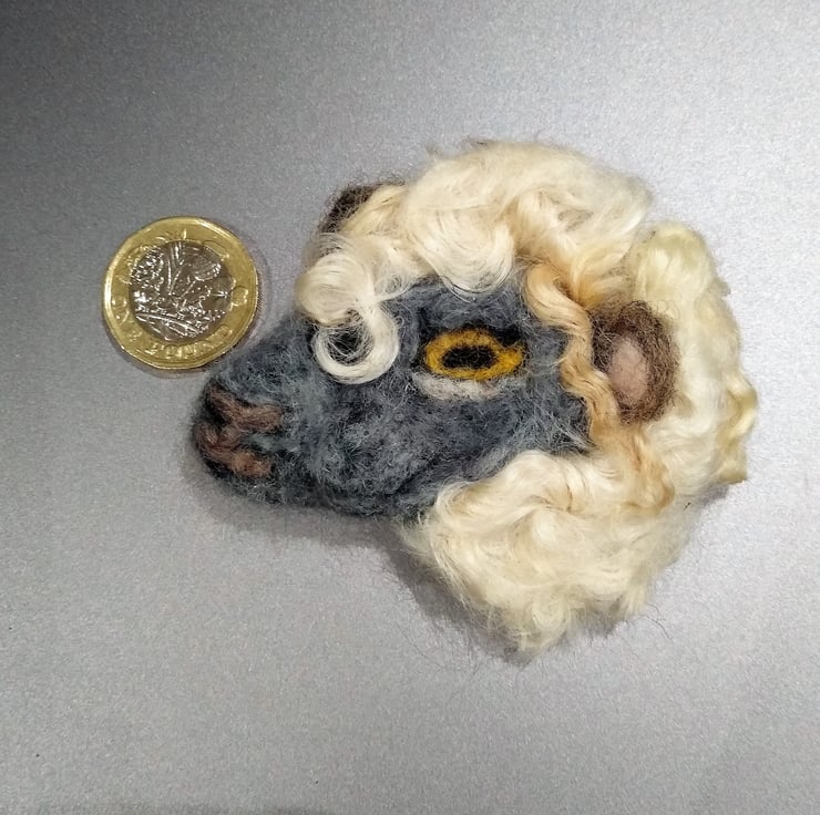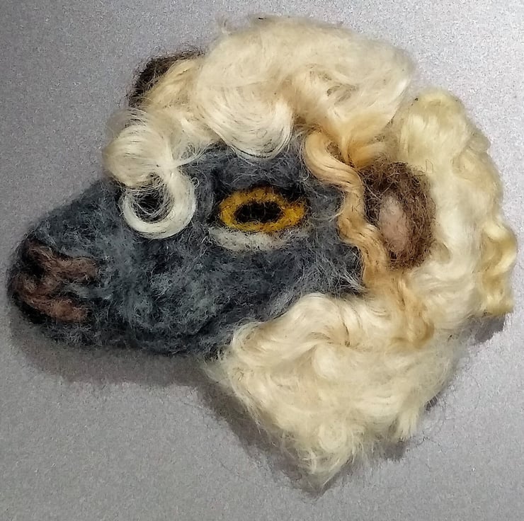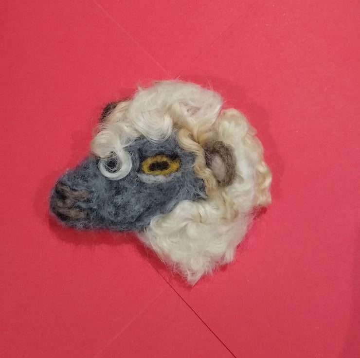 An unusual needle felted sheeps head brooch. Made entirely of hand felted wool and finished with a safety brooch pin on the reverse. Natural Wensleydale curly fleece used. Extremely lightweight and will not pull down on light clothing etc.