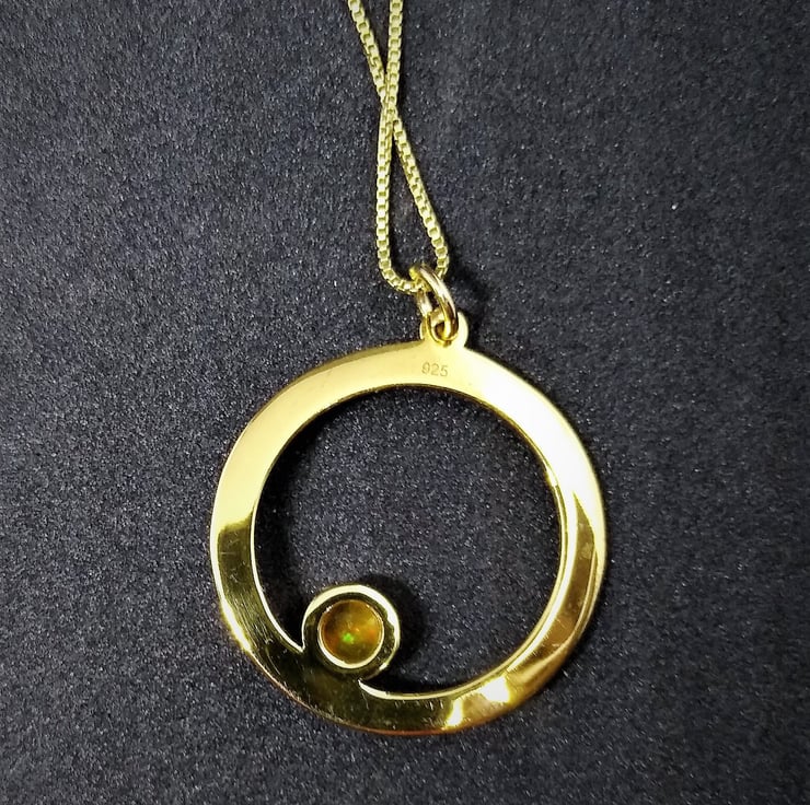 A Stylish and adorable necklace with a stunning natural Ethiopian Opal 5mm 0.30 carats approx, bezel set into a textured circle of gold plated 925 sterling silver, 28x25mm. This beautiful pendant has been hung on a 0.75mm gold plated 925 sterling silver box chain, length approx 18 inch (45cm) finished with a lobster claw clasp approx 10x5mm. The Opal displays the fascinating visual effects created by nature called opalescence also known as play of colour. Giving you flashes of green and red against a a background colour of golden yelloworange.