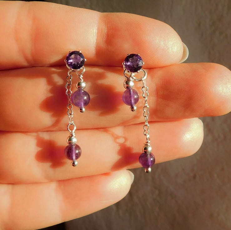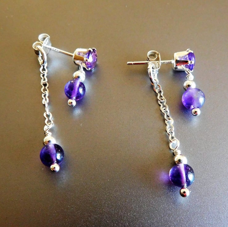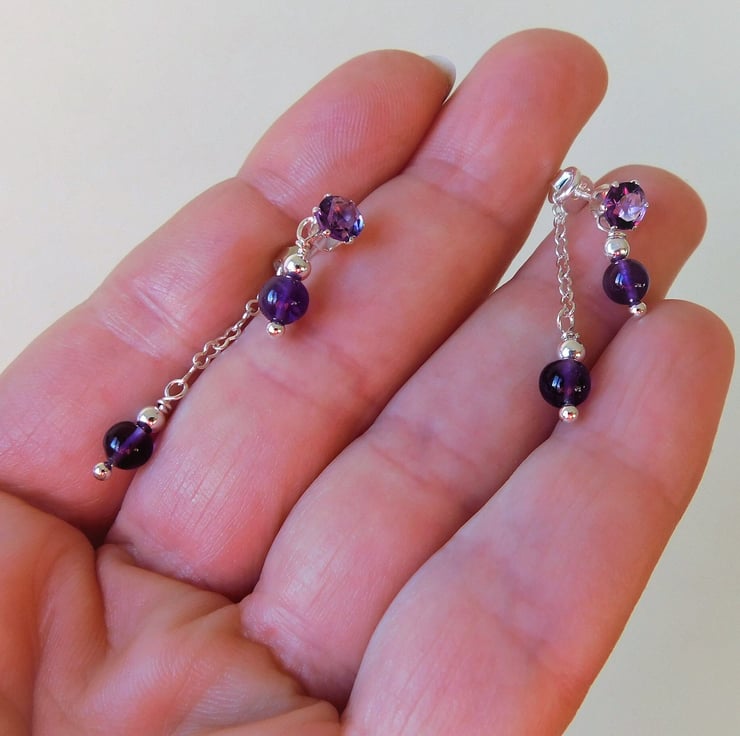 To the front of the earlobe these studs have a 5mm faceted Amethyst prong set into the stud with a 4mm Amethyst dangling 15mm approx below. At the back of the ear attached to the butterfly has been added a piece of infinity link chain with another 4mm Amethyst attached to the end at a length of 35mm approx.