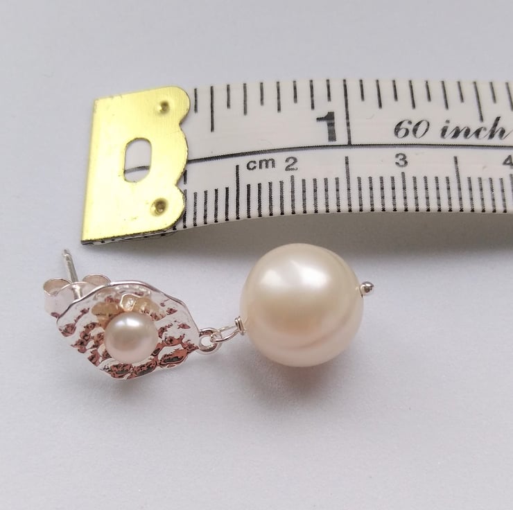 Stunning white freshwater cultured Pearl and 925 Sterling Silver Textured Stud Earrings. The earring has two pearls, one 3mm round approx, fixed in the middle of the textured silver diamond leaf shape of the stud, then hanging from the main stud element is another pearl, size 10x11mm approx. The larger pearls display the natural growing rings. The Silver stud has been stamped 925.