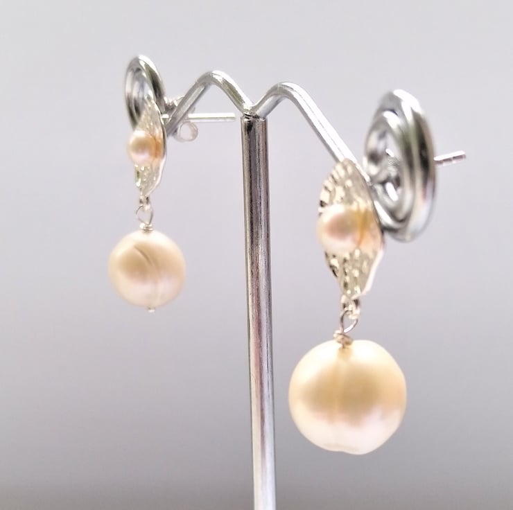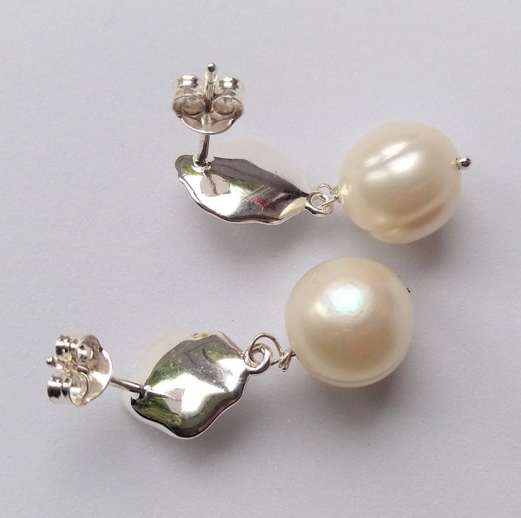 Stunning white freshwater cultured Pearl and 925 Sterling Silver Textured Stud Earrings. The earring has two pearls, one 3mm round approx, fixed in the middle of the textured silver diamond leaf shape of the stud, then hanging from the main stud element is another pearl, size 10x11mm approx. The larger pearls display the natural growing rings. The Silver stud has been stamped 925.