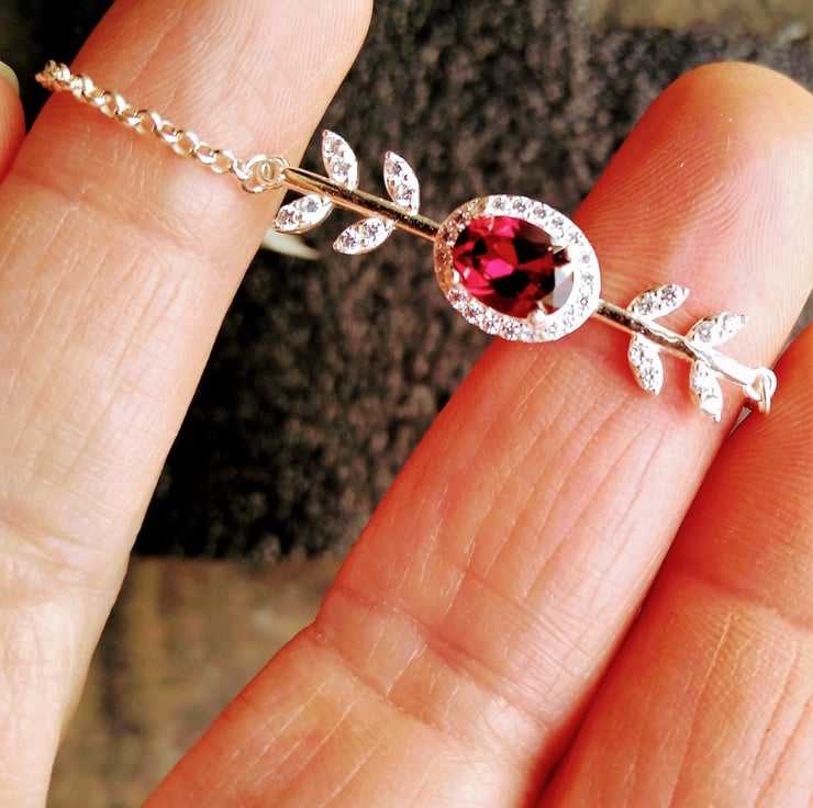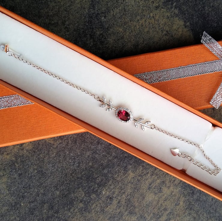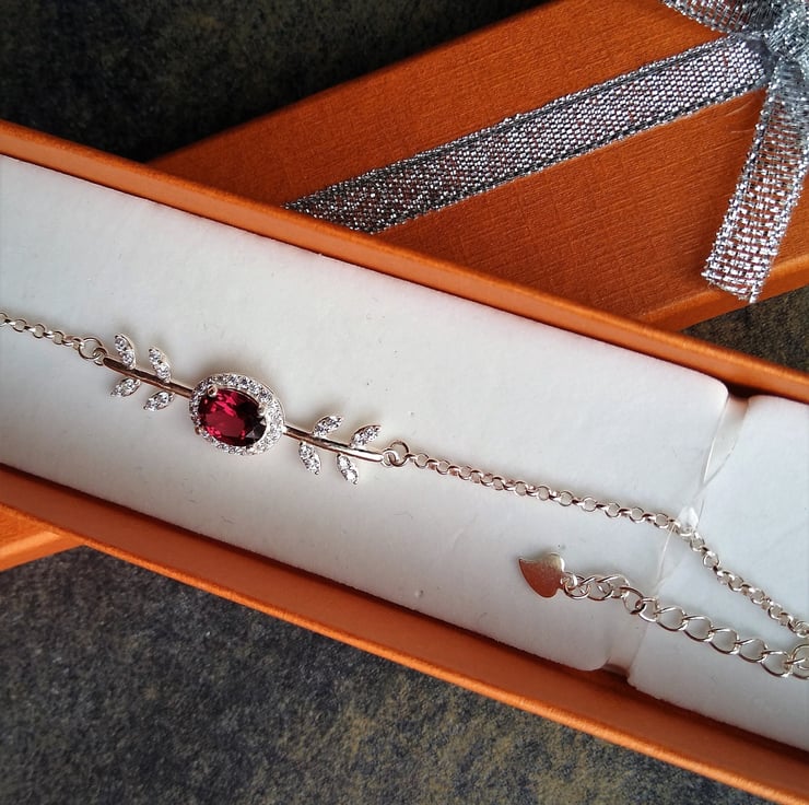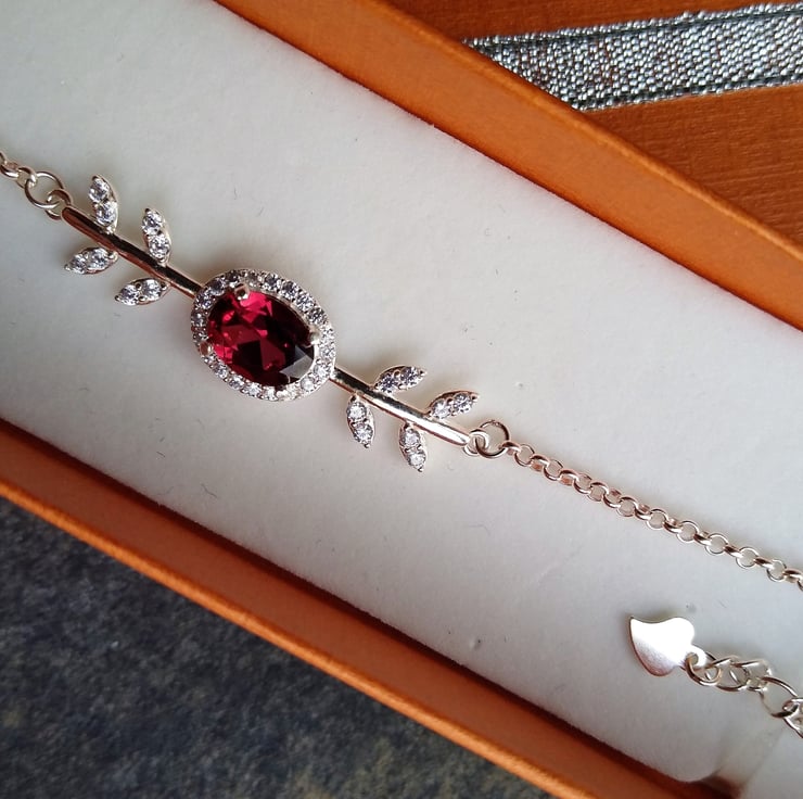 A fiery red Garnet centred in a sparkling cubic zirconia vine of leaves, finished with a delicate cable chain to 6 inch with a 1 inch extender and heart charm. Garnet is a time-honoured symbol of constancy, compassion and love.