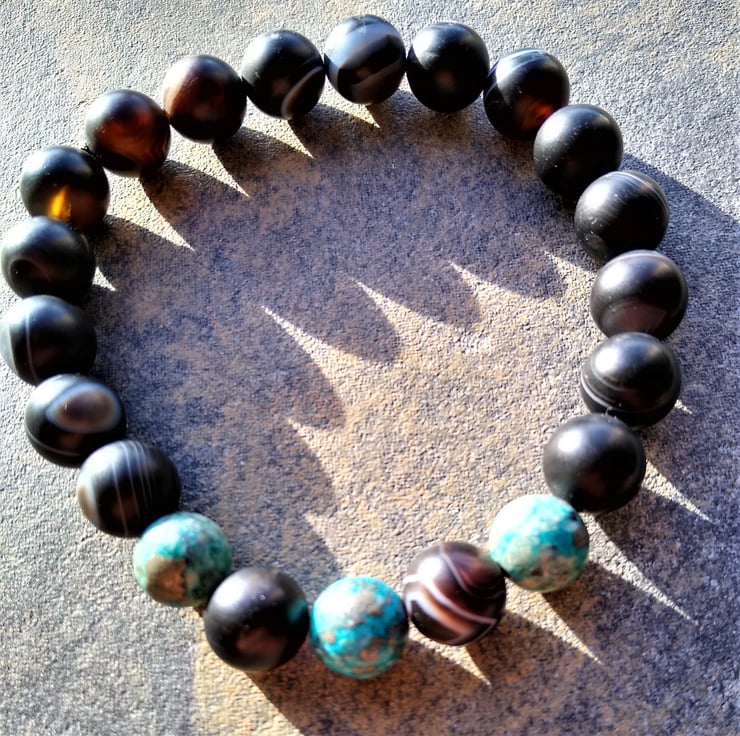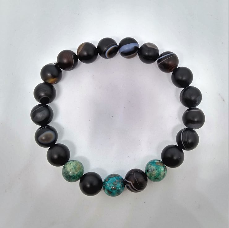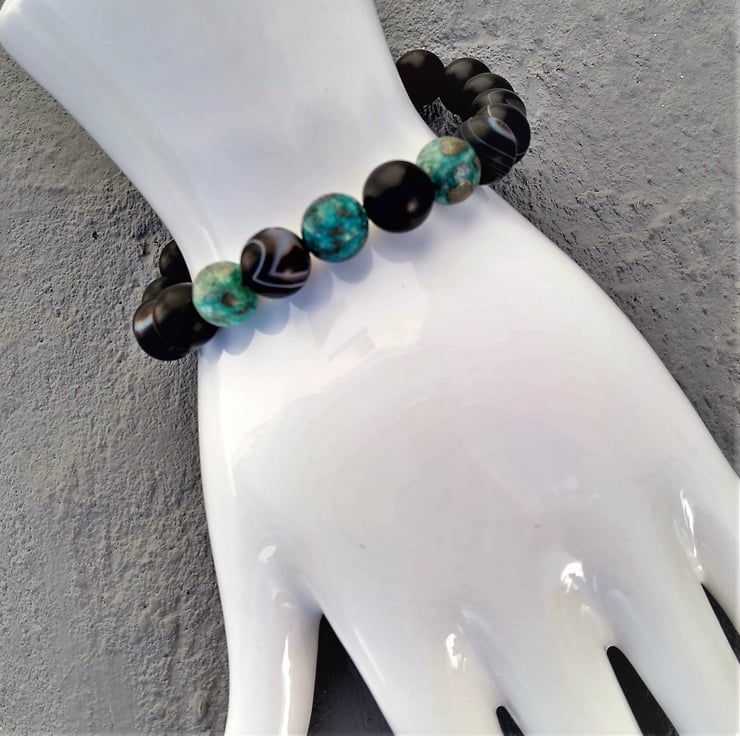 Easy wear stretchy bracelet, made with matte black stripe Agate and turquoise blue Jasper. Hand strung on to black jewellers elastic to fit size 7 - 8 inch ( 17 - 20 cm) approx.