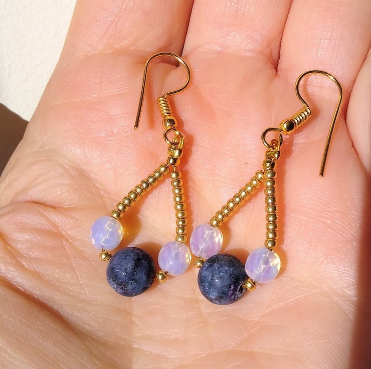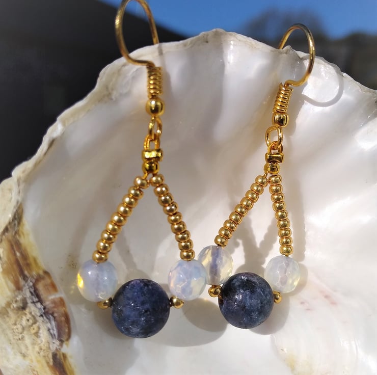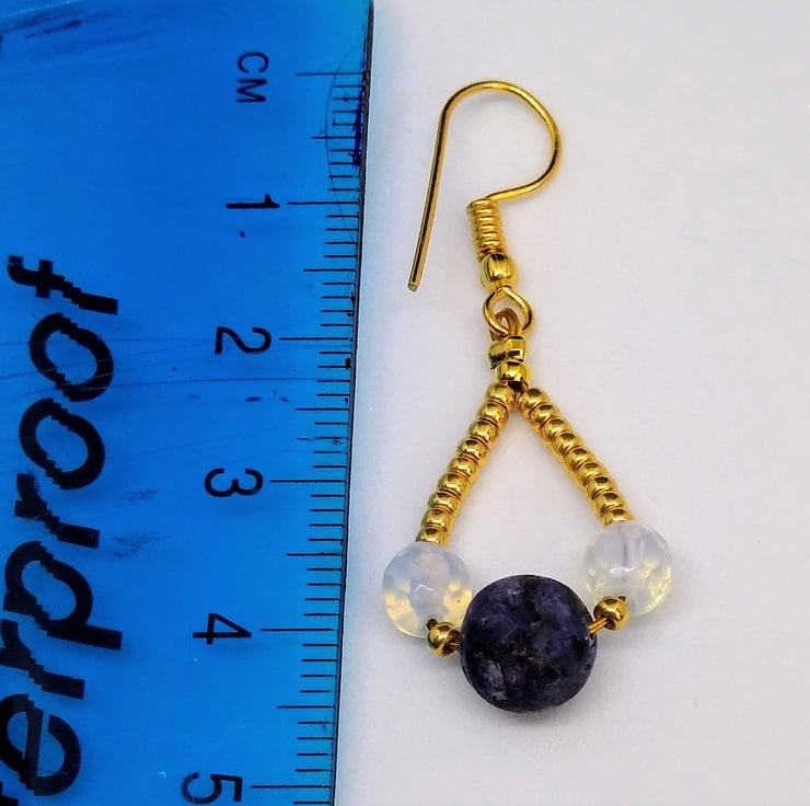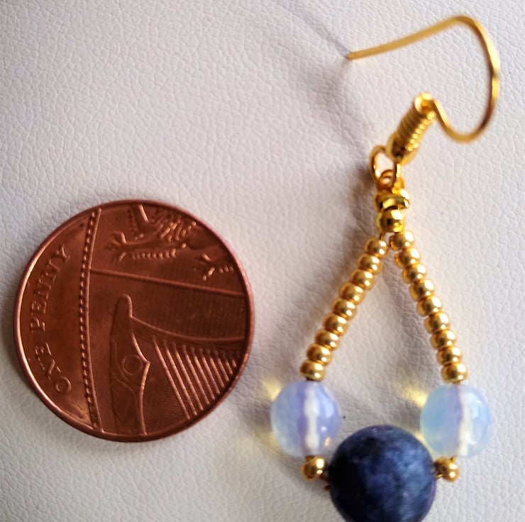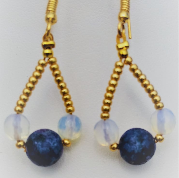 FrostedMatte denim Blue coloured Jasper (8mm rounds) with Opalite faceted 6mm beads and gold coloured glass seed bead drop earrings on a gold plated shepherd hook earwire. The Opalite catches the light and appears to glow from within. An easy wear, everyday pair of earrings that will look great worn casual or dressed up at a special occasion. Full drop lenth is 4.5cm approx.