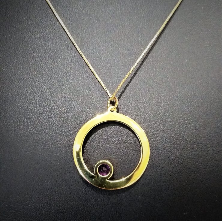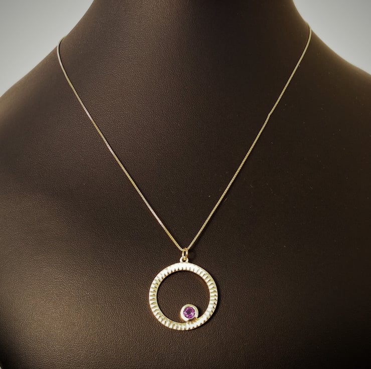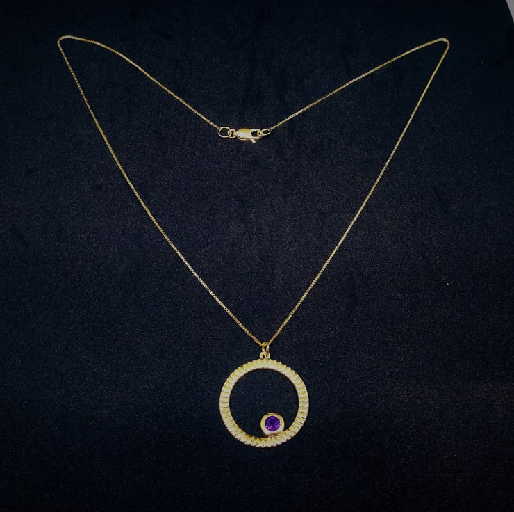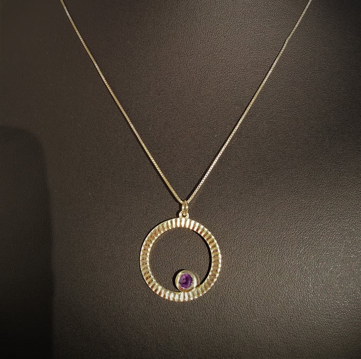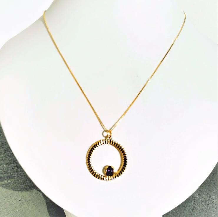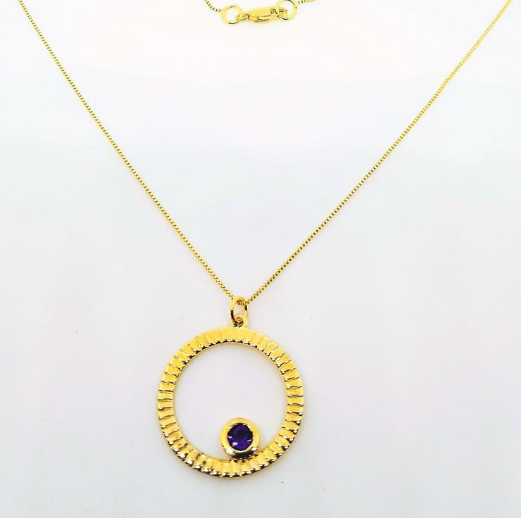 A Stylish and adorable necklace with a lovely deep rich purple Amethyst 5mm 0.40cts approx, bezel set into a textured circle of gold plated 925 sterling silver, 28x25mm. This beautiful pendant has been hung on a 0.75mm gold plated 925 sterling silver box chain, length approx 45cm finished with a lobster claw clasp approx 10x5mm.