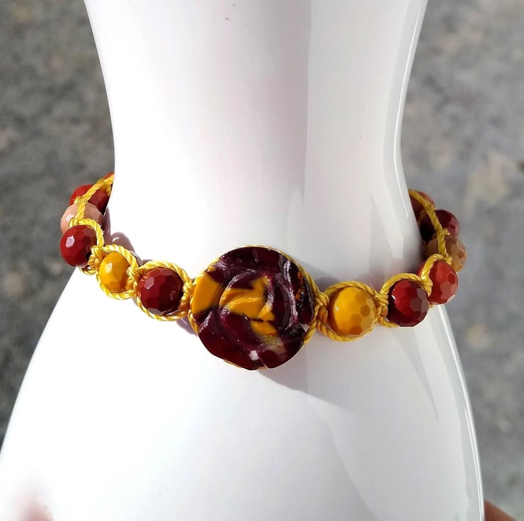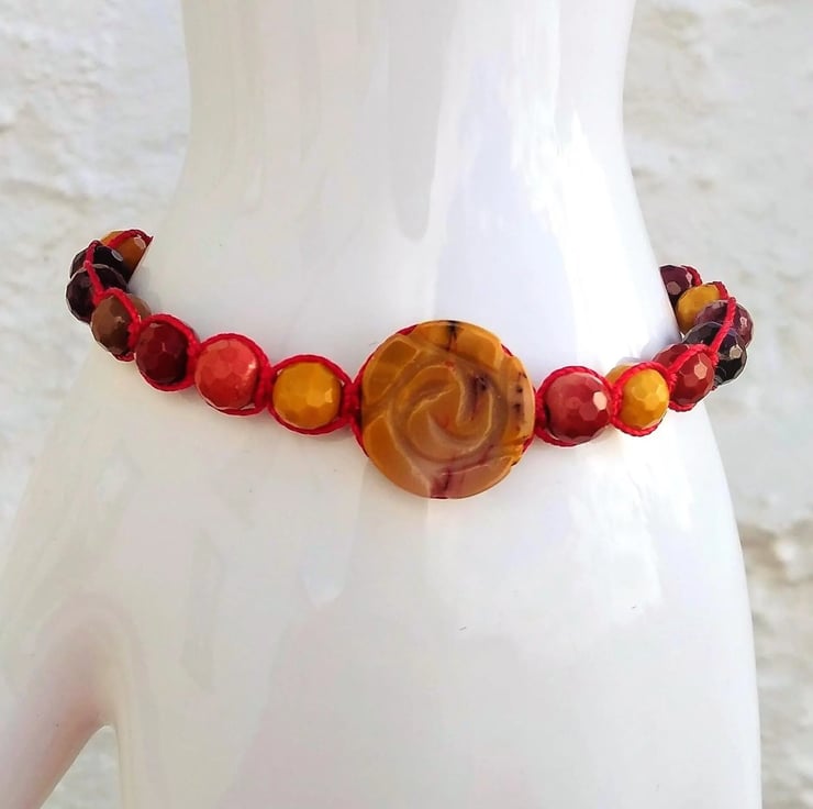 Genuine Australian Faceted 6mm Mookite with a 16mm rose carved coin Mookite on a hand made macrame adjustable bracelet. Beautiful earthy, autumnal colours coupled with a fiery mix of red and yellow. Gently pull the corded sides of the bracelet to open fully to allow you to slip the bracelet easily over your hand and then holding both of the two ends of the cord pull gently to obtain a comfortable fit for you. The bracelet size is from 6 inch (15cm) to 8 inch (20cm) approx. Colours of the gemstones are as shown in the photos.