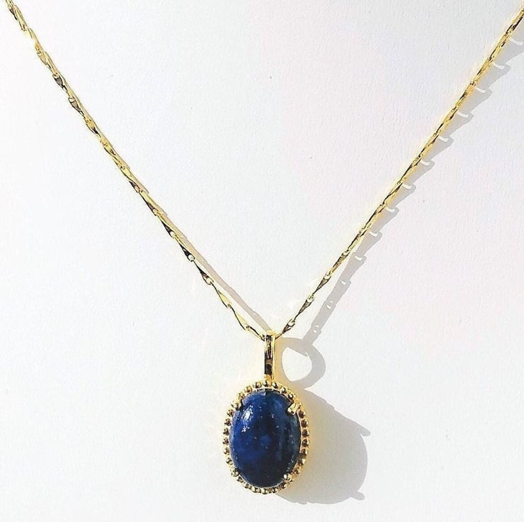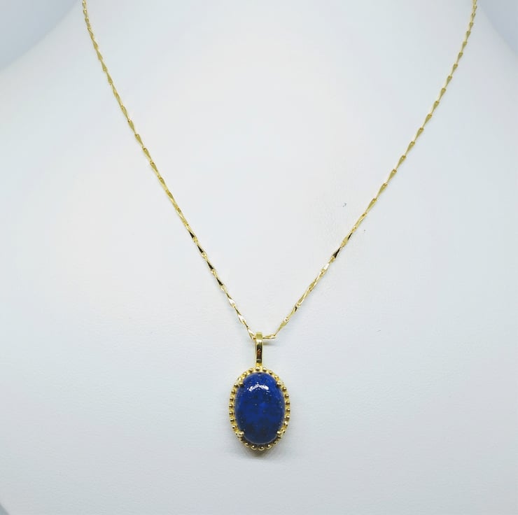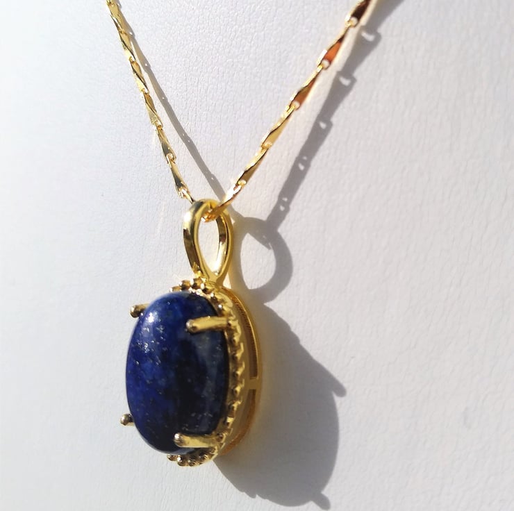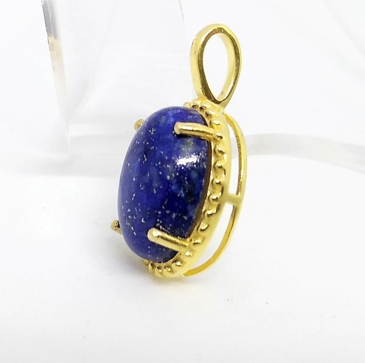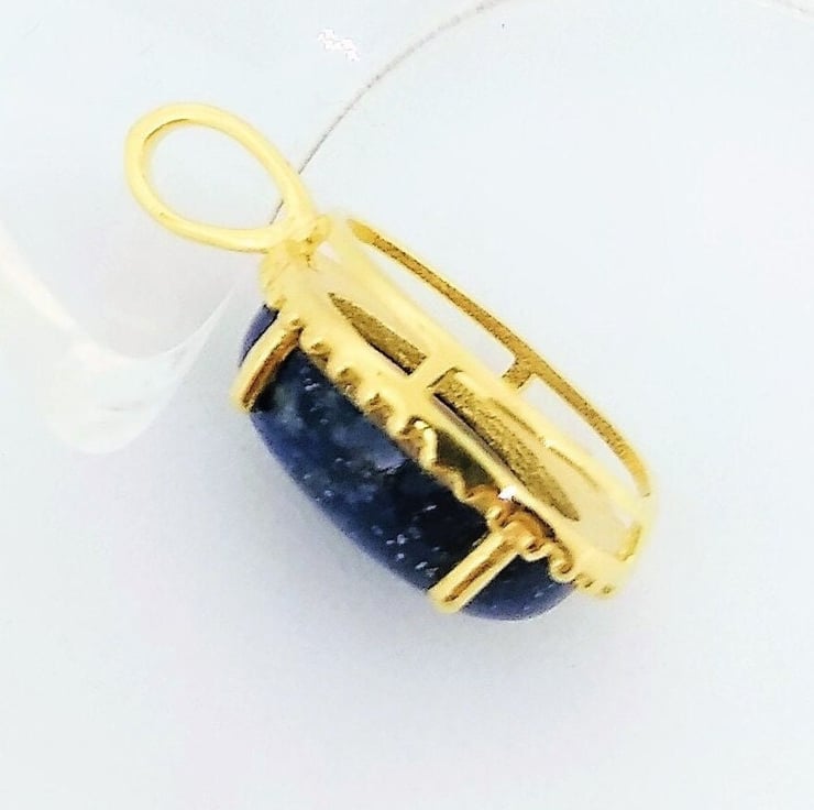 A high quality natural, unenhanced Lapis Lazuli cabochon 14x10mm, from Sar-i-sang, Afganistan, were the world finest Lapis Lazuli is mined from the ancient mines. This semi precious stone has been hand set into a gold plated 925 sterling silver pendant mount, which has decorated accent to the rim around the stone. The lapis Lazuli is a deep intense dark blue, opaque colour and shows off tiny specks of golden pyrite in sunlight. I can supply a certificate of authenticity for the gemstone if required, please let me know on purchase and I can email it to you.