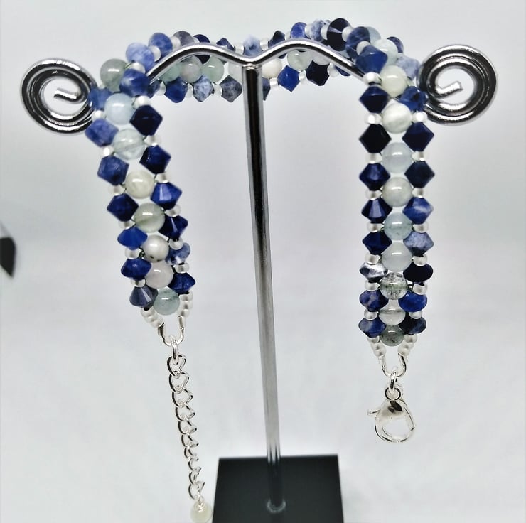 Genuine smooth 4mm round Aquamarine centered between the rich dark blue of the 4mm faceted Sodalite bicones, resembling the gentle waves of the sea. This bracelet is comfortable to wear and will be suitable for many wrist sizes, ranging from 6 - 8 inch with the use of the extender chain.