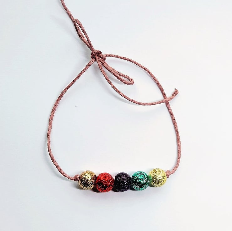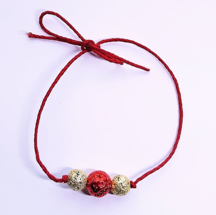 8 Red Hemp cord, 8mm metallic red Lava Rock & 6mm gold coloured Lava Rock