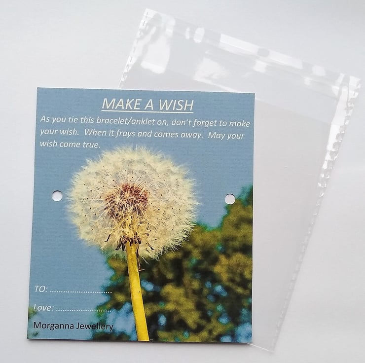 Grant someone special a wish and hope that their dreams will come true, by gifting them one of these handmade cord & beaded braceletanklet. Each one comes tied to the Make a Wish card and in a self seal cellophane pocket, ready to seal once you have added the names to the card.