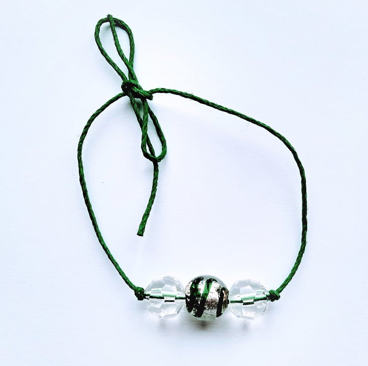 7 Green Hemp cord, 10mm faceted clear glass & 10mm silvergreen foiled glass