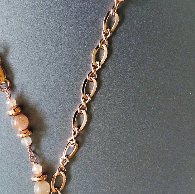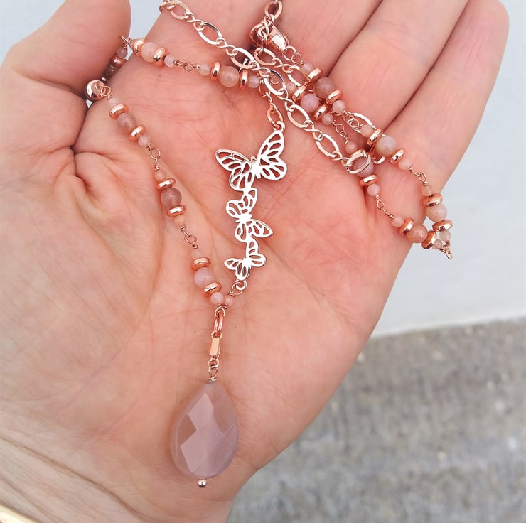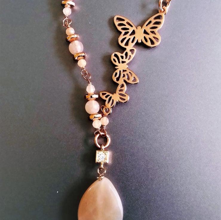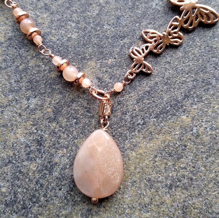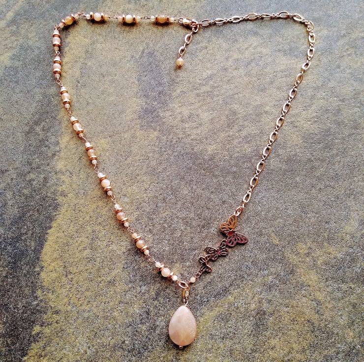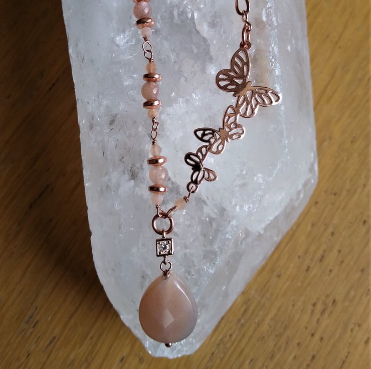 Rosegold Butterfly & Peach Sunstone Asymmetric 20 inch 51cm Necklace