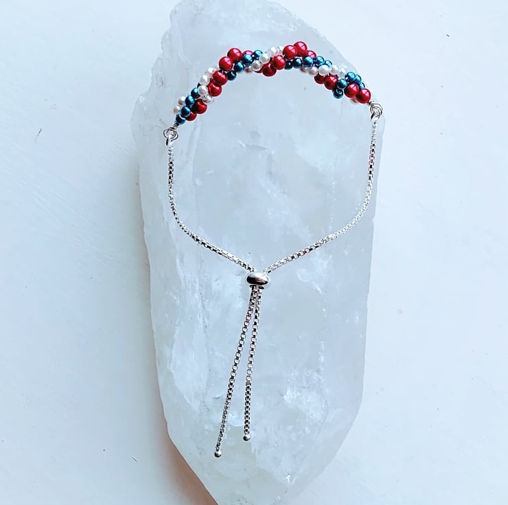 Red White & Blue Twisted Pearl Bubble Silver Plated Slider Bracelet