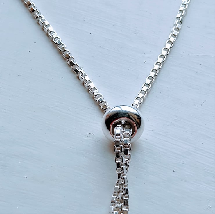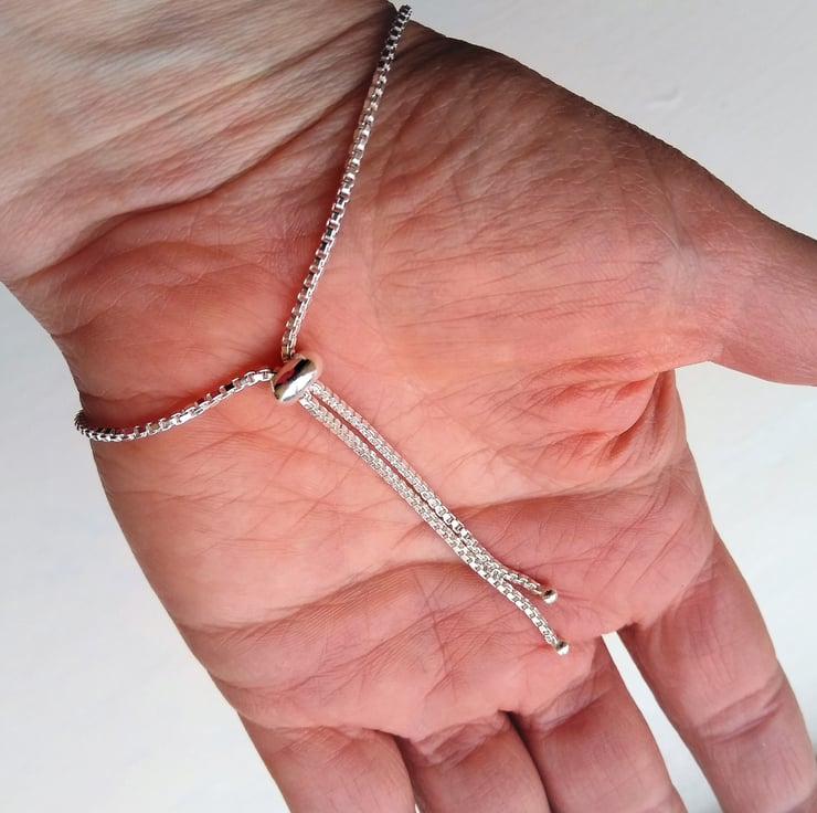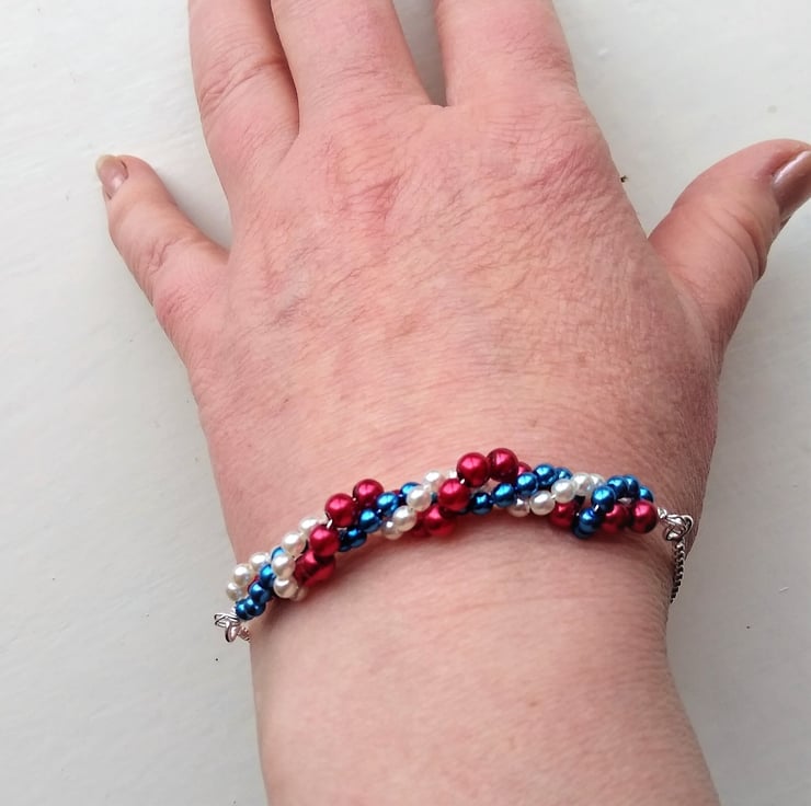 This silver plated easy to wear slider bracelet will fit most wrist sizes from 6 - 8.75 inch, as long as it will fit over your hand at a maximum of 9 inch. It is easily adjusted once on your wrist by gently holding the two chain ends and moving the slider bead up or down as required. The bracelet is finished with a twist of red white and blue glass pearls, ideal for a child or adult.