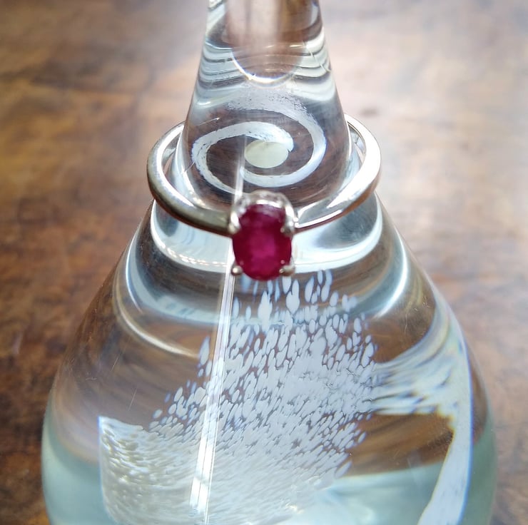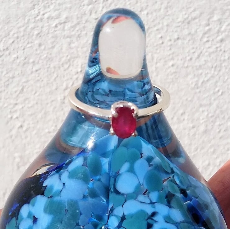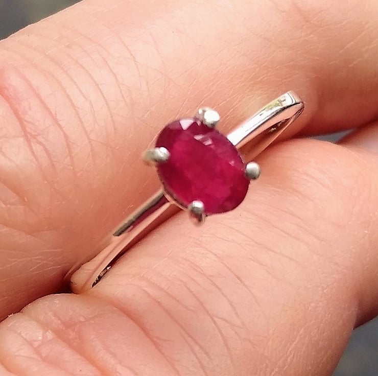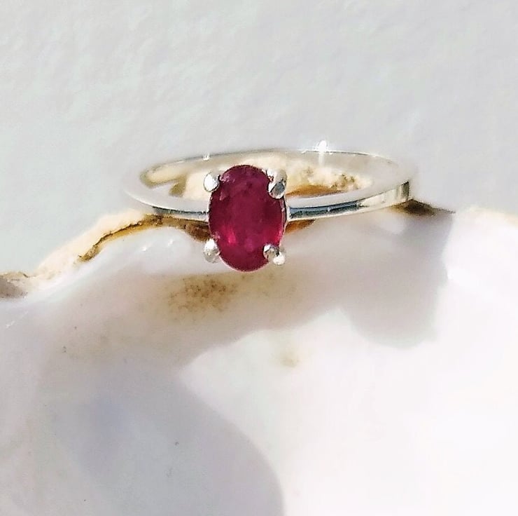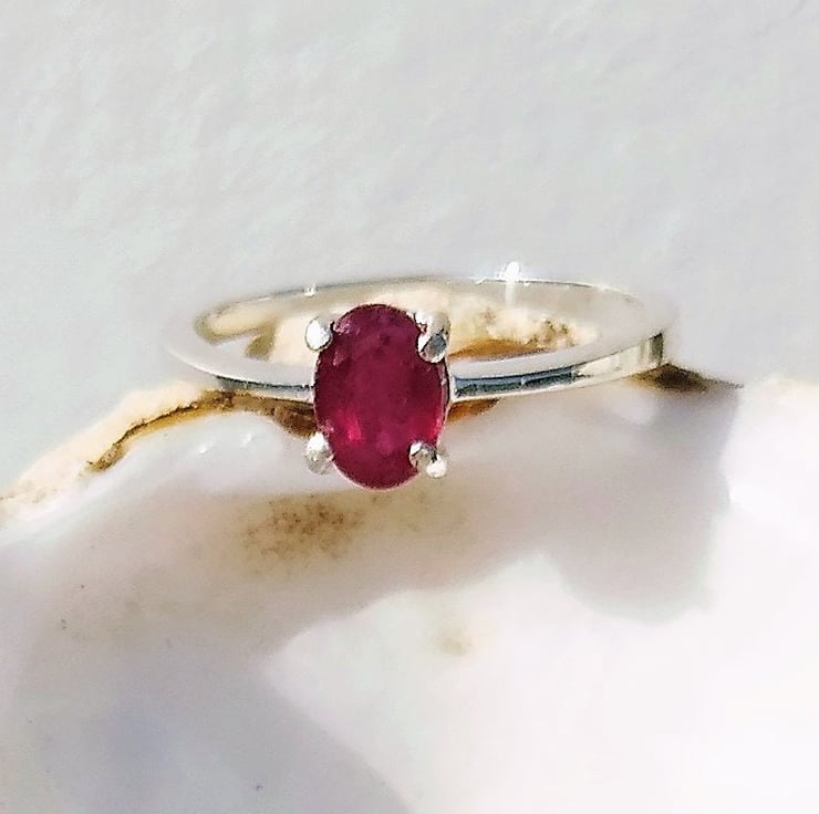 Genuine 0.5ct Ruby, Brilliant cut 7x5mm oval from Thailand, beautiful vivid red colour, set in a 925 sterling silver ring. Size R-S (or size 9 or 59). I can supply an authenticity certificate for the Ruby if required, please let me know and I can either email this or post with the ring.