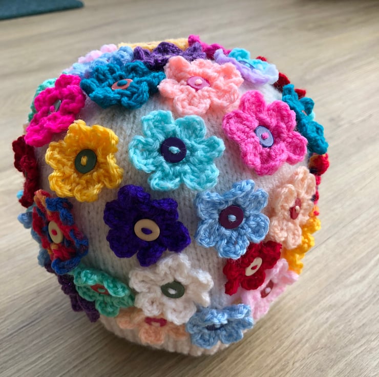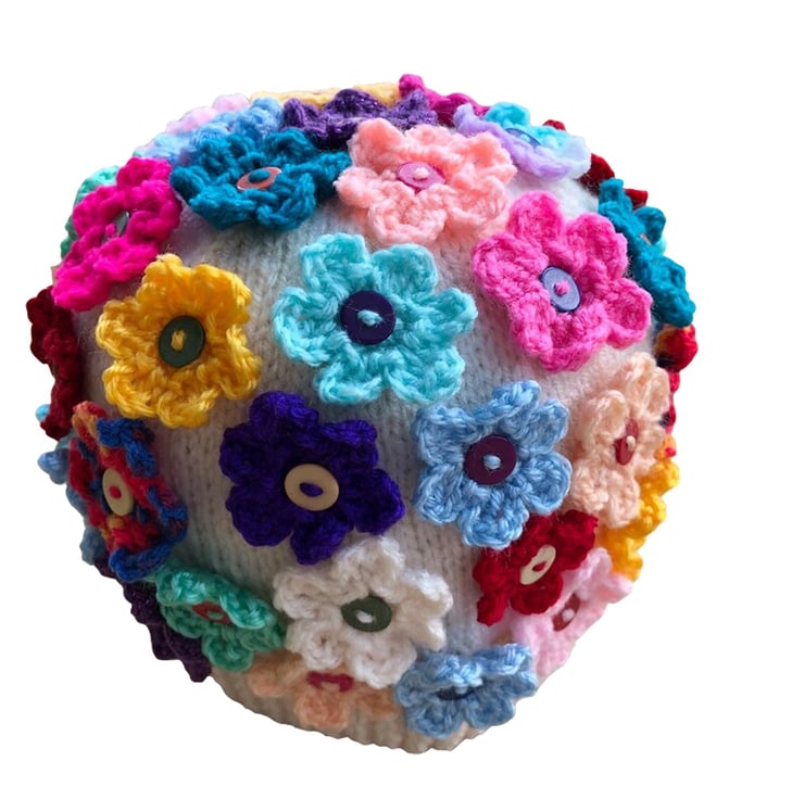This is a hand knitted cream coloured hat covered in multi coloured crochet flowers about fifty altogether sewn to base with multi coloured buttons. A unique and lovely gift for Easter, looks really pretty on.