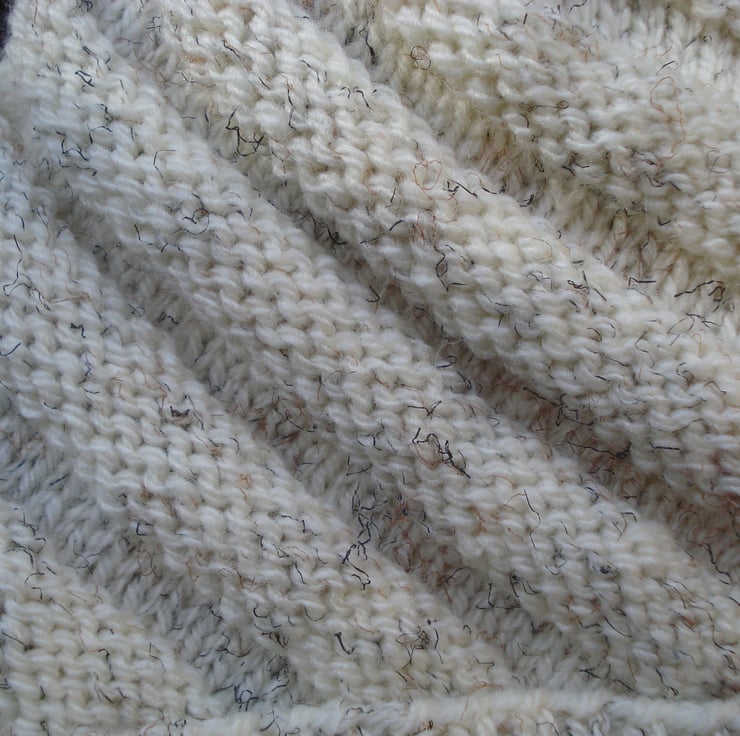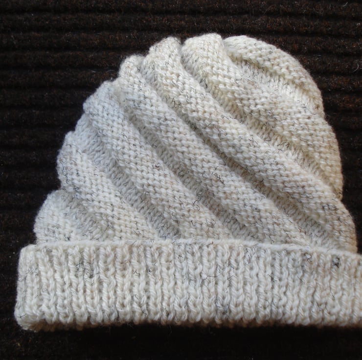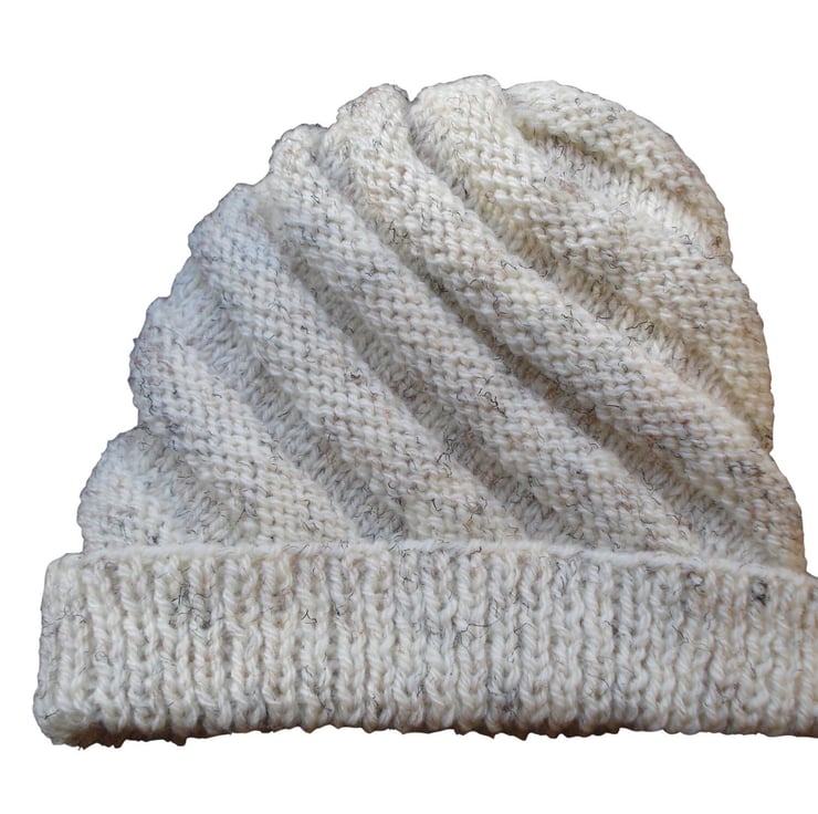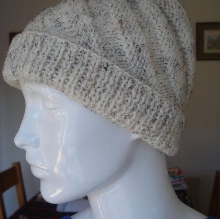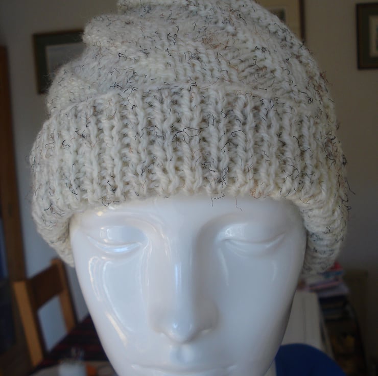 This is a really warm hat for with a twist. The yarn is a chunky Aran cream with small flecks of black. Great for those winter months to come and a good Xmas gift as one size fits all adults.