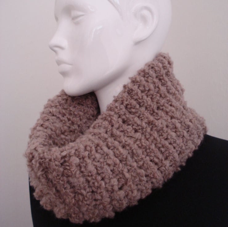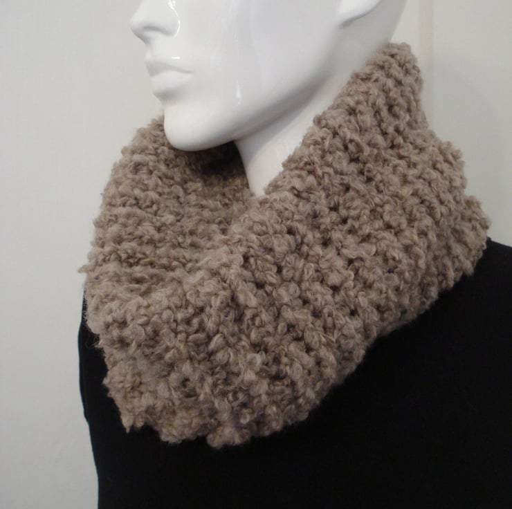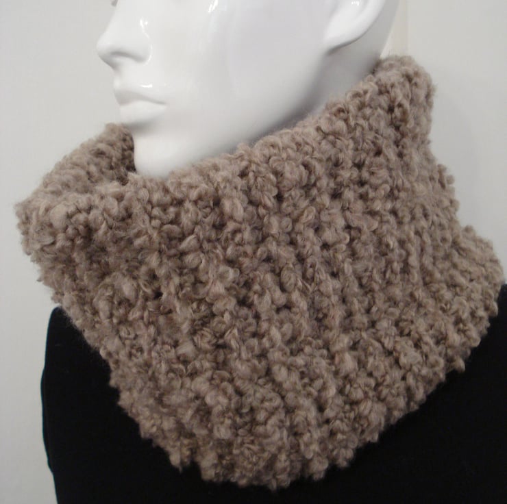 This is a lovely soft double sided chunky brown neck cowl or neck warmer hand knitted in a poodle yarn. It is really very soft and warm to wear. Size 14cm wide and 68cm round before stretch.