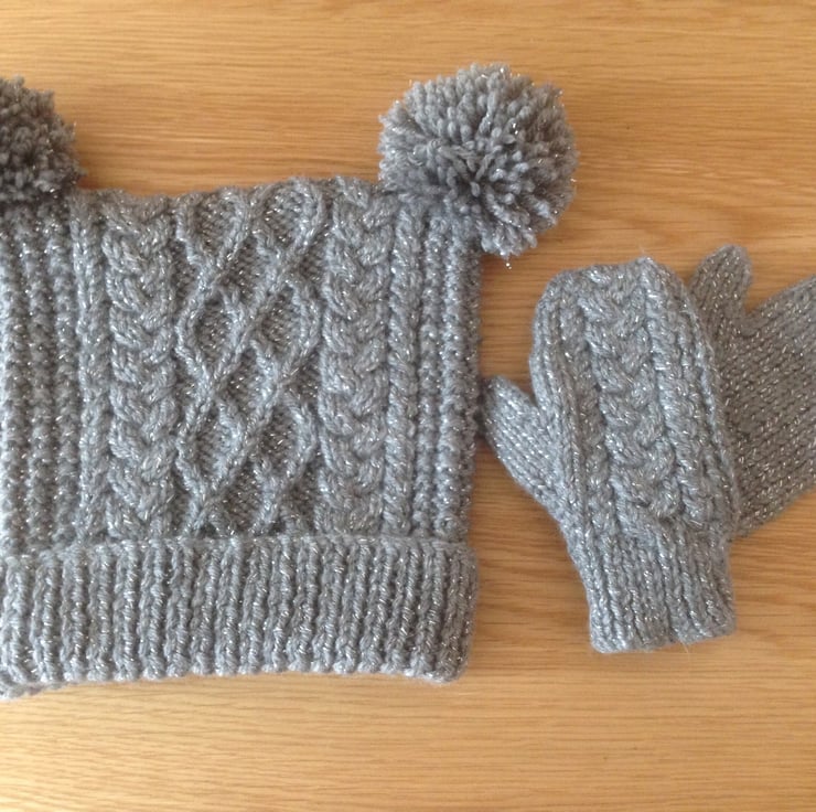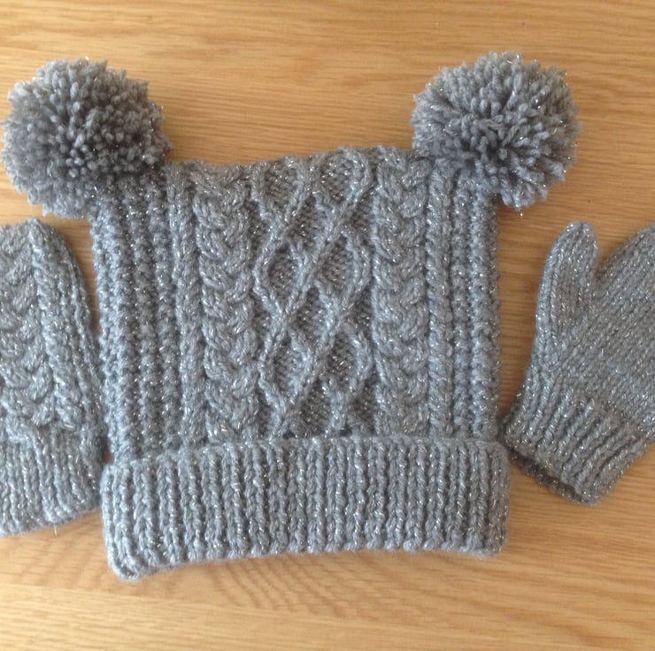 Funky Grey Sparkle Hat And Mittens With Cables And Bobbles Great Gift (R368)