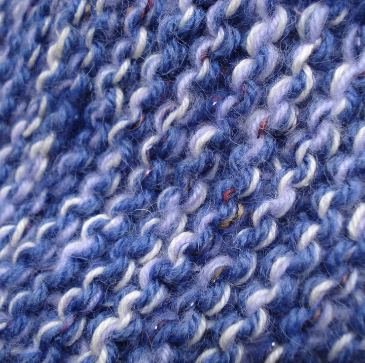 This is a lovely chunky scarf hand knitted with five yarns some wool some acrylic. The basic colour is a hyacinth blue with lilac cream and a touch of sparkle. Would be a great gift.