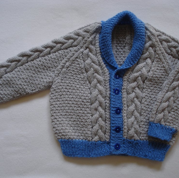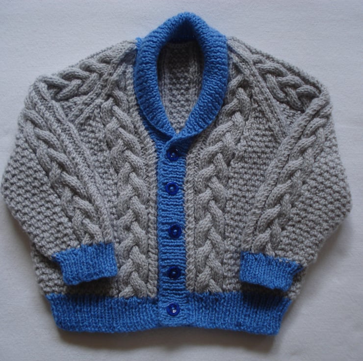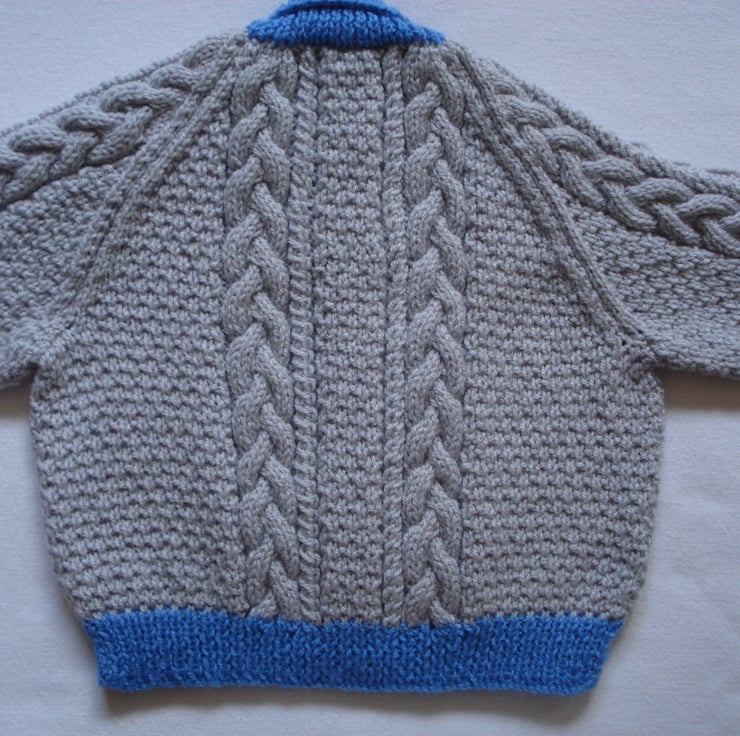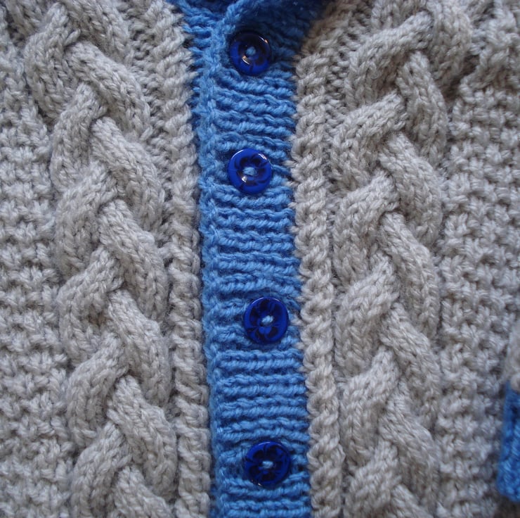 This is a Silver grey jacket with blue trim looks really smart. The cables give it a nice chunky feel, the roll collar will be snug around the back of the neck, the front is fastened with 5 blue buttons.