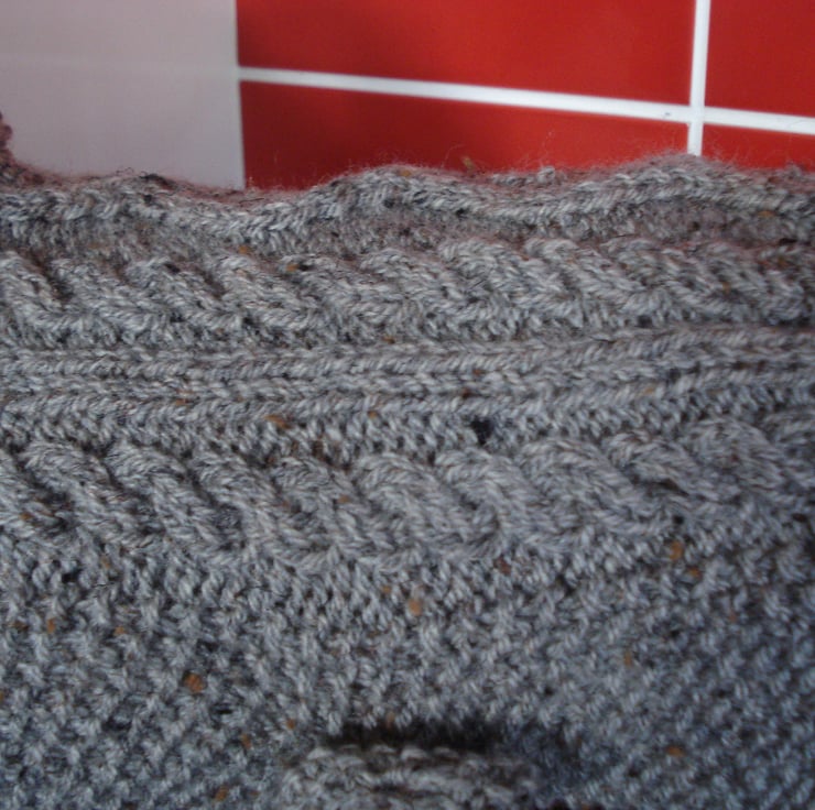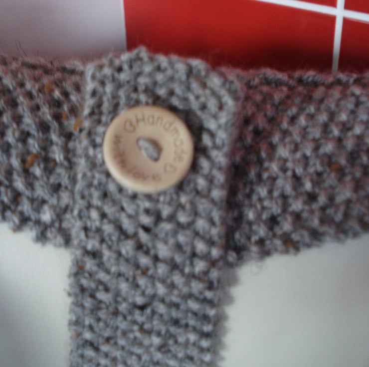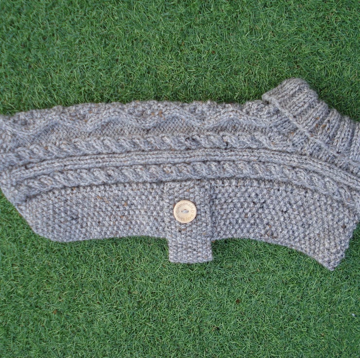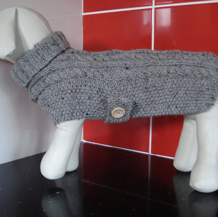 This is a hand knitted acrylic and wool Aran polo neck jumper for a medium dog. The yarn is called herringbone tweed, there is an opening at the back of the neck to take the lead. There is a strap which is fixed to one side with a wooden button the other end has three buttonholes which can fasten with another button on the other side. The buttons have "Handmade With Love" on them. View some of the other coats on dogs to see how this will look.
