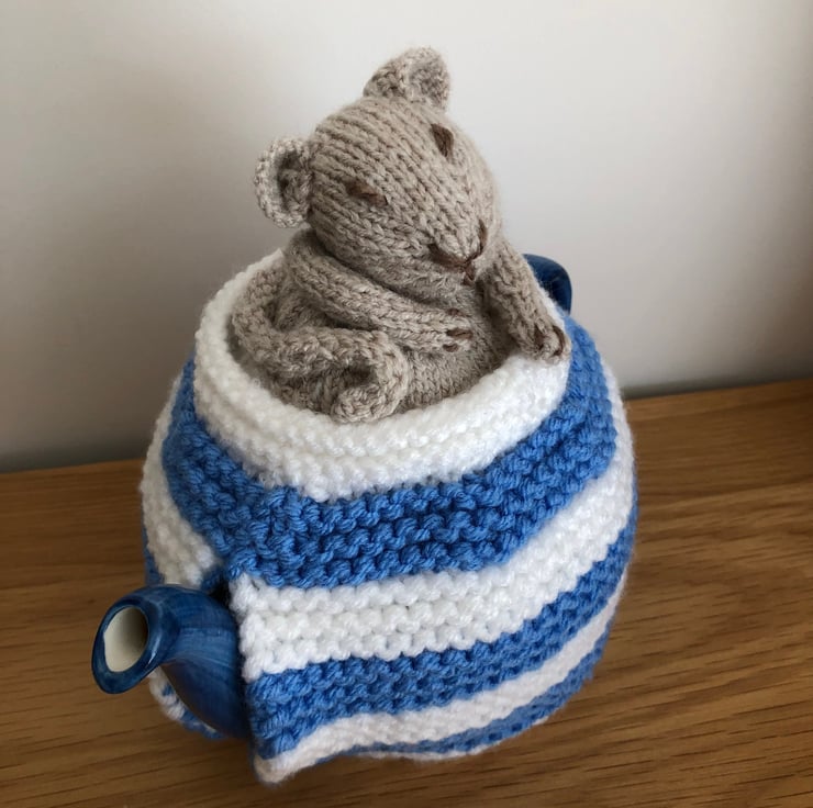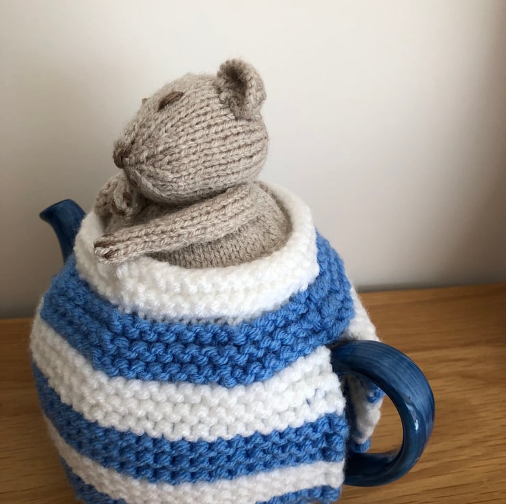This is a striped blue and white tea cosy with a little sleepy dormouse looking out of the top. The cosy is nice and thick and will fit a 3-4 cup teapot. The little dormouse is fully stuffed and is quite solid. This would make a great gift. Please note teapot not included and the colour of the dormouse may be slightly different.