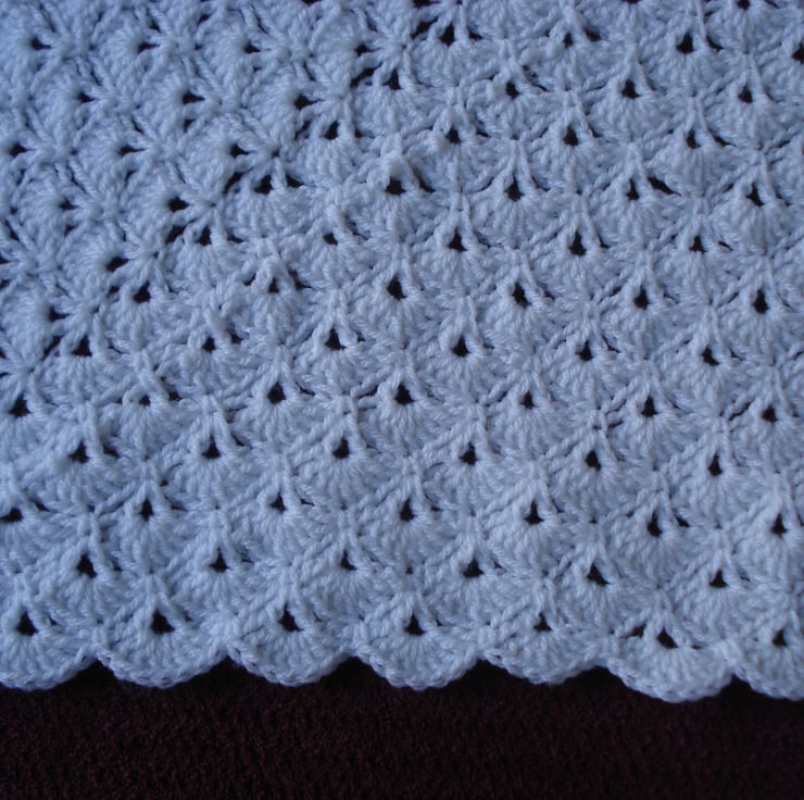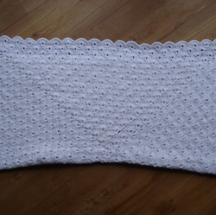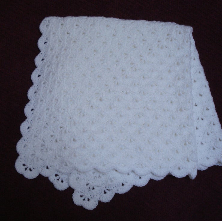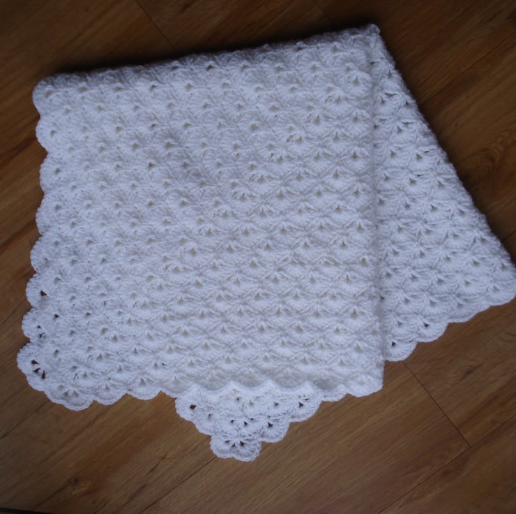This is a hand crochet shawl Blanket in what people are calling the Virus pattern but is also called German Shells. The yarn is soft pure white acrylic and it feels really thick and cosy. It is a great size as it drapes really well when wrapped around baby. Can also be used as a blanket. I would recommend hand washing and drying flat.