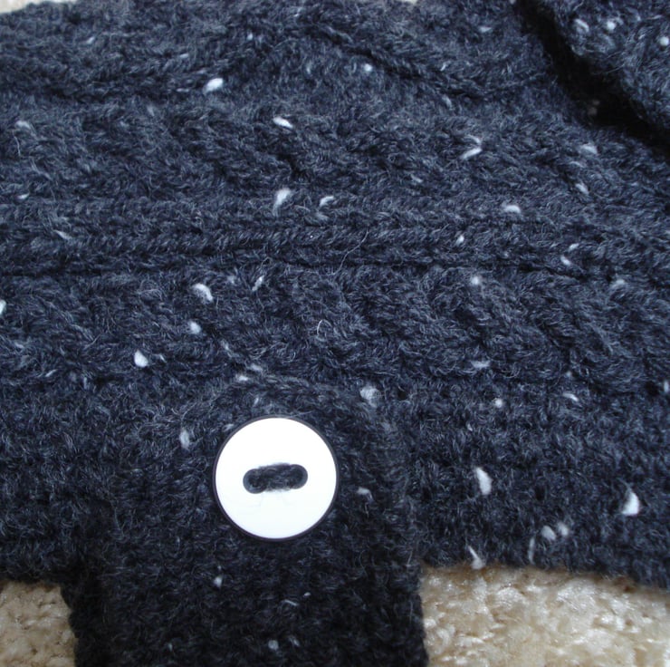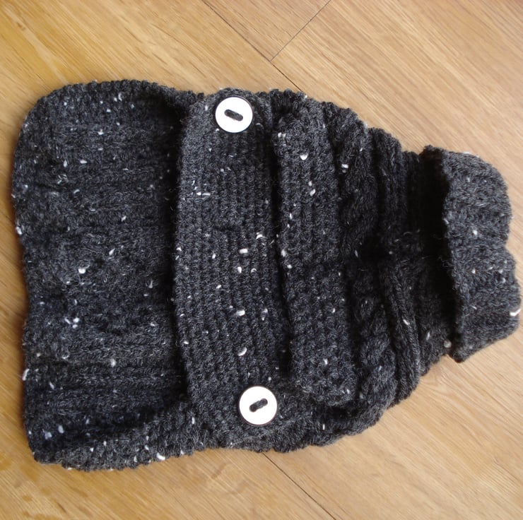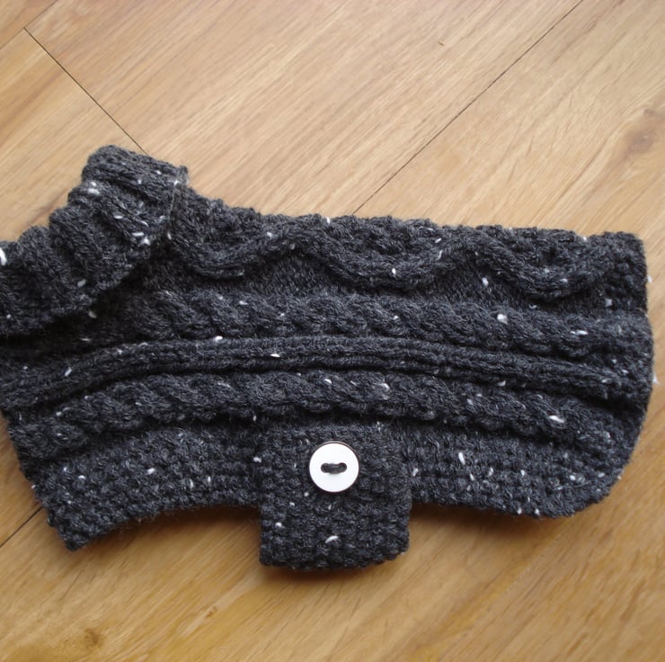 This is a hand knitted acrylic and wool Aran polo neck jumper for a small dog, there is an opening at the back of the neck to take the lead. There is a strap which is fixed to one side with a white and black plastic button the other end has three buttonholes which can fasten with another button on the other side. View some of the other coats on dogs to see how this will look.