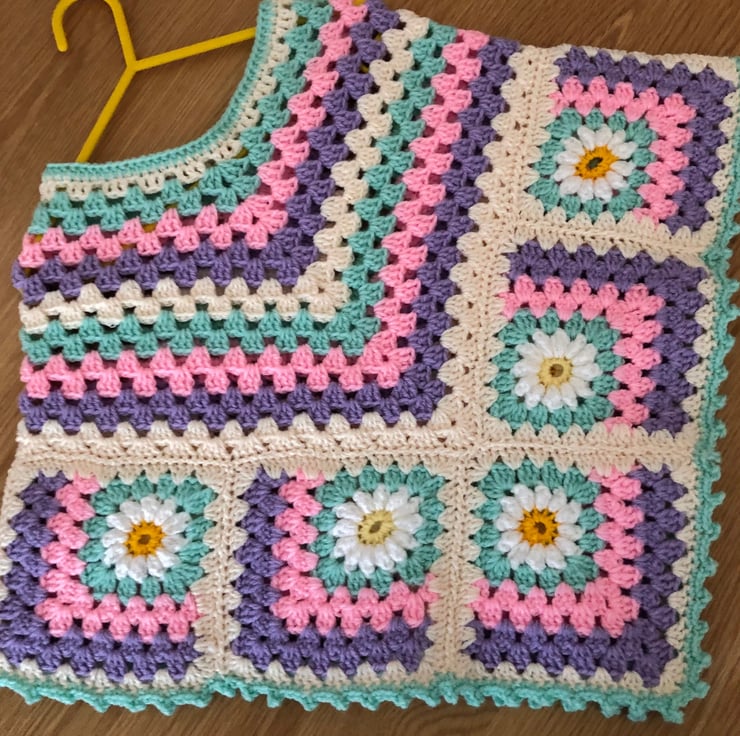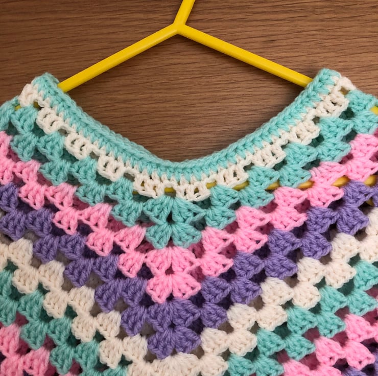 This is a crochet poncho with multi pastel colours and flower squares along the bottom. Would fit 2-3 years approx. Actual size: Neck to Point 44cm, Neck to Wrist 33cm, Neck 48cm approx.