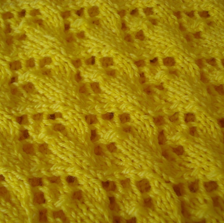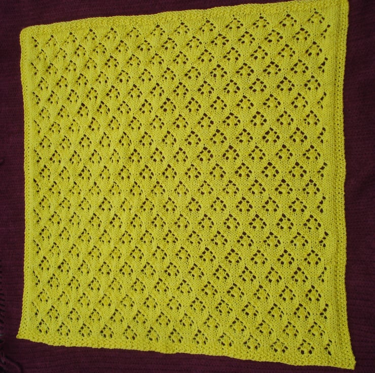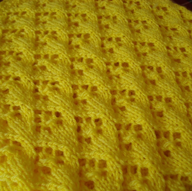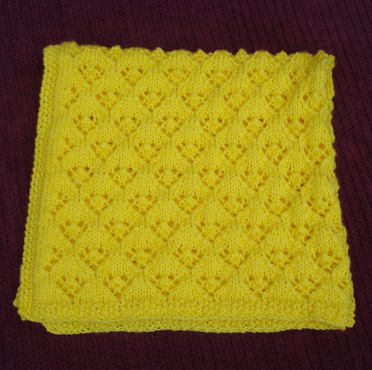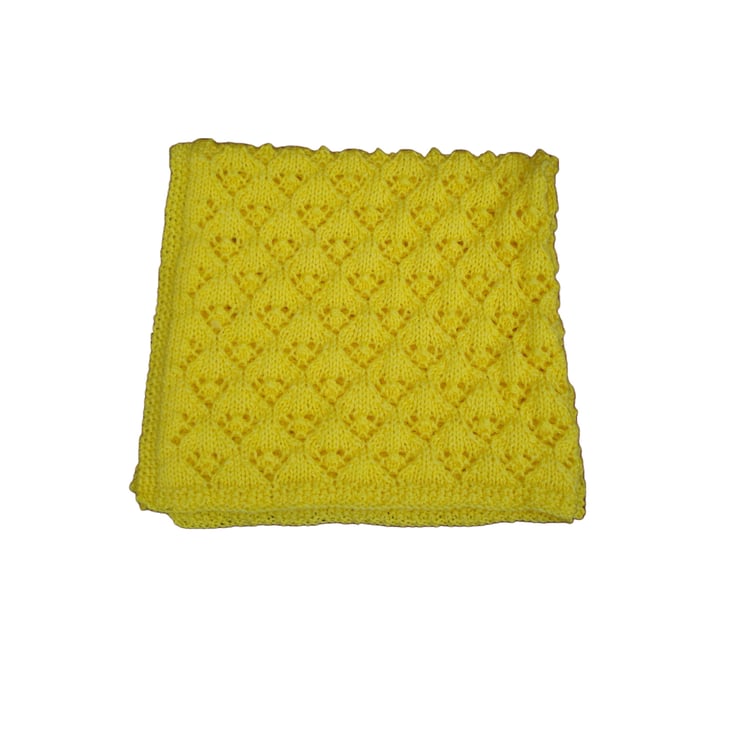 This is a hand knitted blanket in a lovely sunshine yellow soft acrylic. The blanket has a chevron lace pattern which makes it light but warm. It would be a lovely gift for a new born baby.