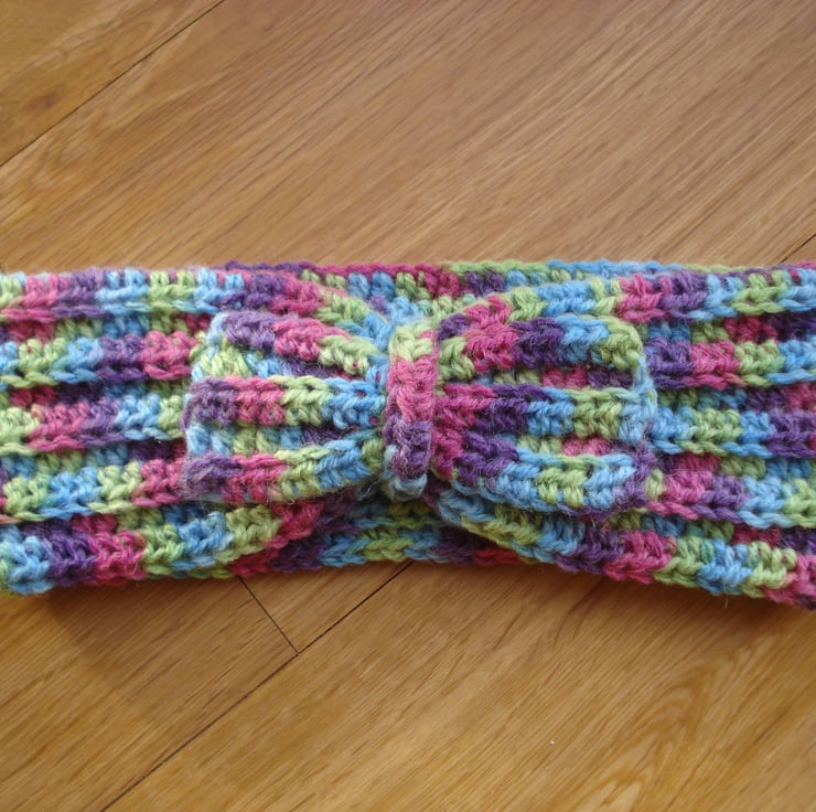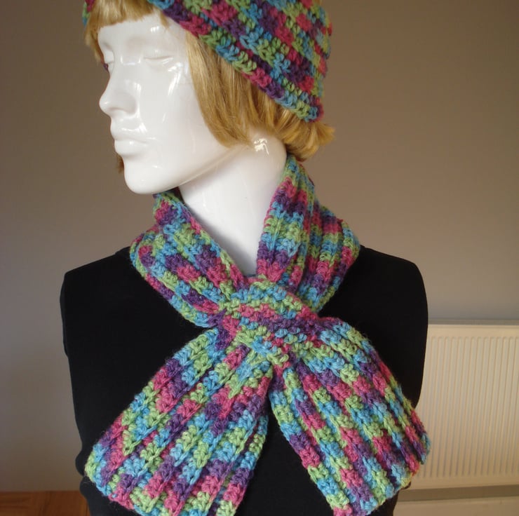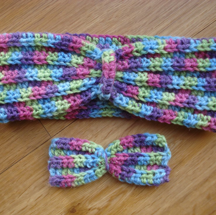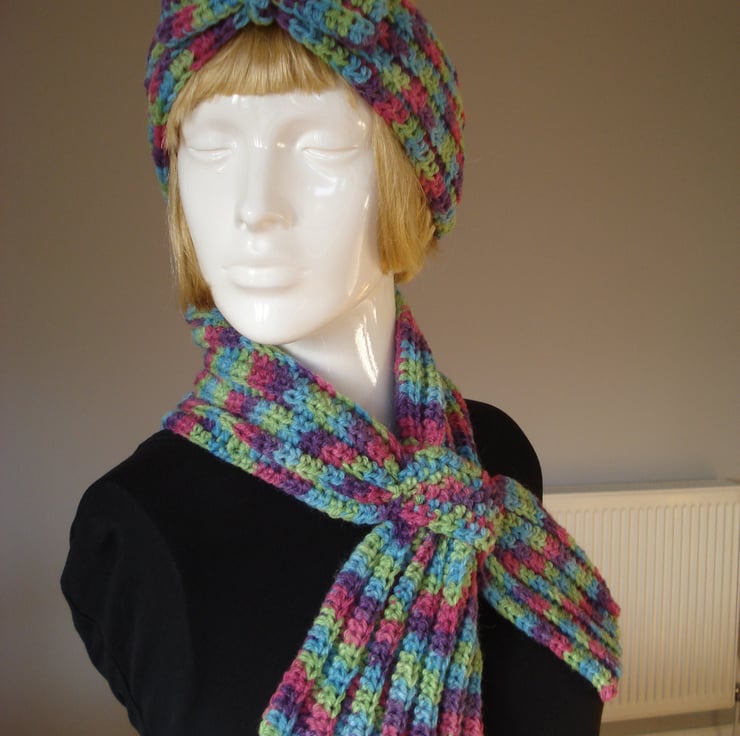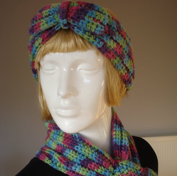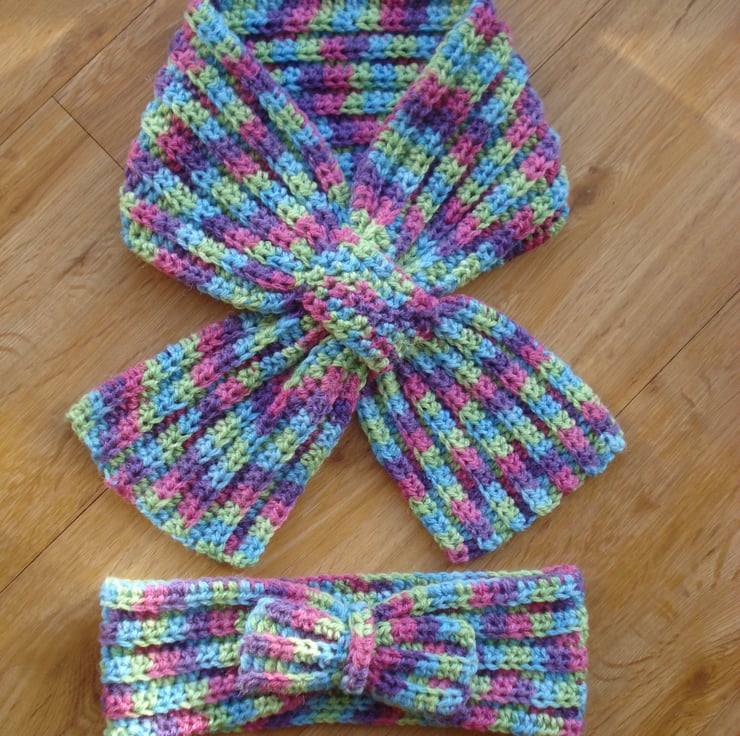 This is a crochet set of a scarf and headband. The yarn is a wool and acrylic thick Aran in pinks, greens and blues, really warm and cosy. The scarf pulls through a small tube opening at the neck, looks great inside a coat or over a jumper, really neat. The headband is in the turban style and made with the same yarn to match the scarf it also has a removable bow. Would make a great gift.