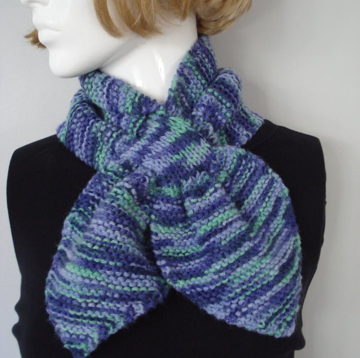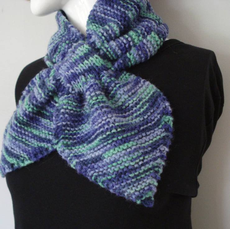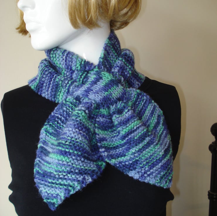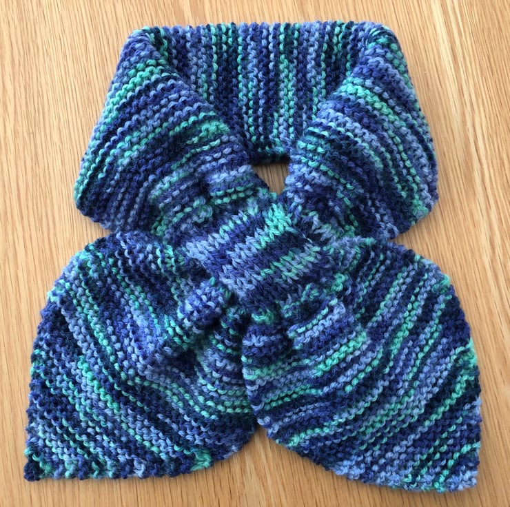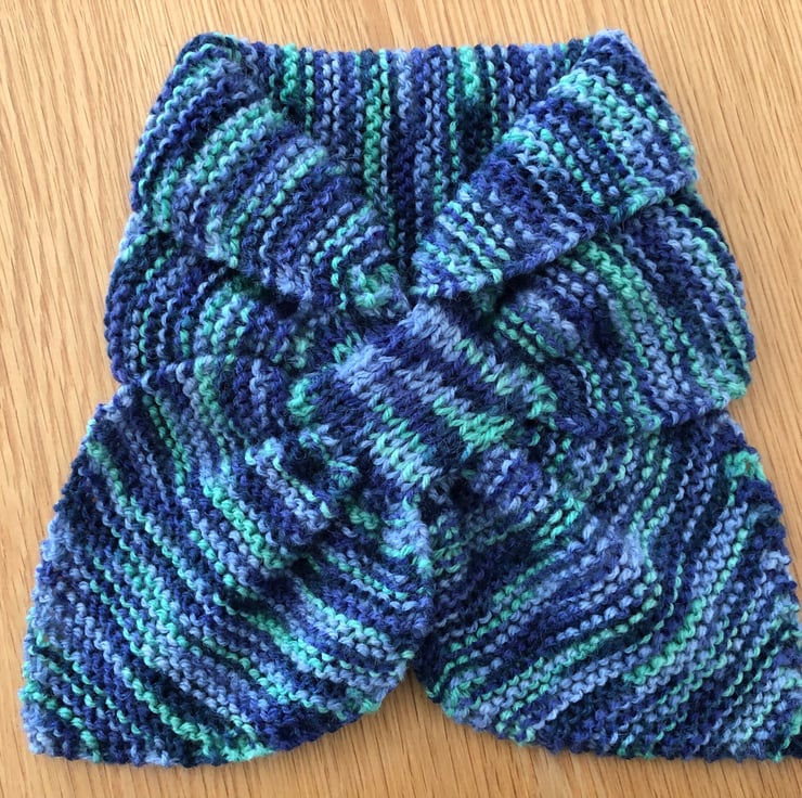 This is a hand knitted Ascot scarf one end pulls through a knitted tube in the front so you do not have to pull it over the head. Knitted in a mix of blues and greens wool and acrylic Aran. It is lovely and warm around the neck. As you can see it can be worn in three different styles, from the full width around the neck to a fold down collar and also folded in half to reduce the width. Wear it over a jumper or inside a coat.