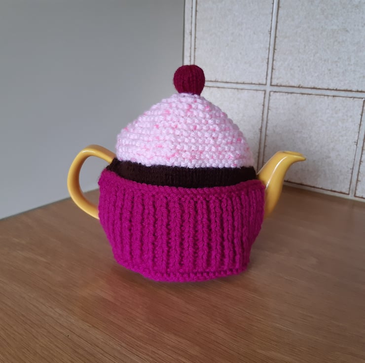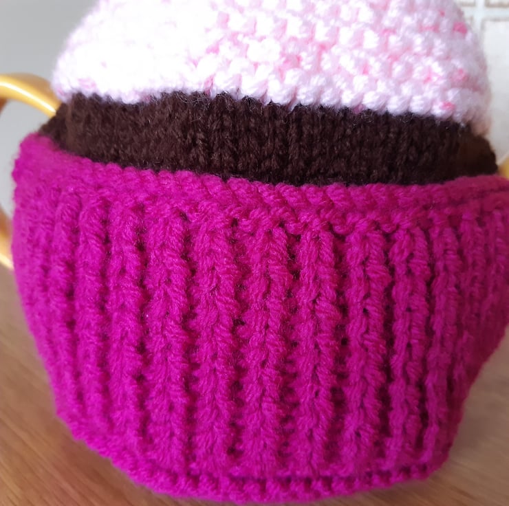 This is a hand knitted 4-6 cup tea cosy in the shape of a chocolate cupcake, definitely non fattening. It is topped with a dark pink cherry, the icing is pink with flecks of darker pink.