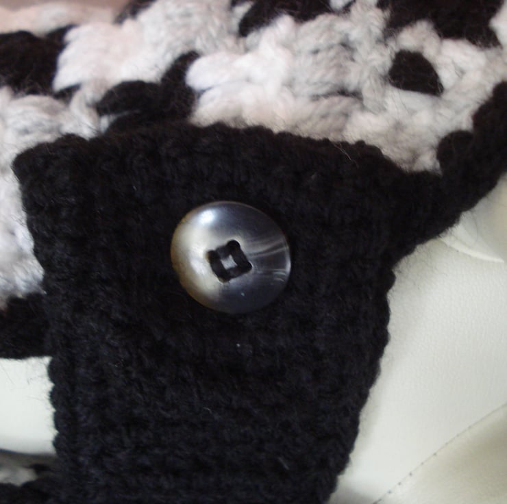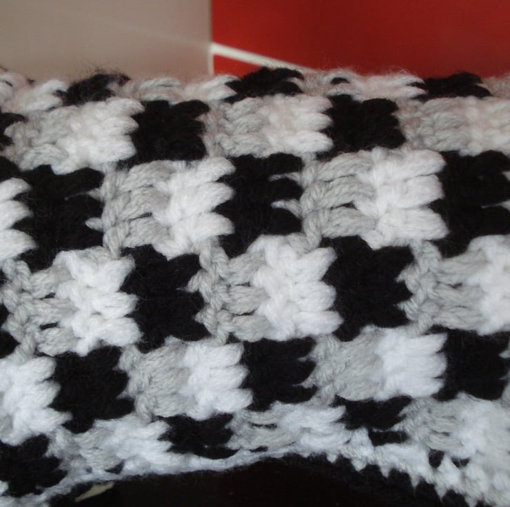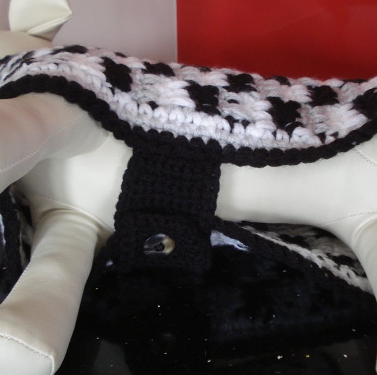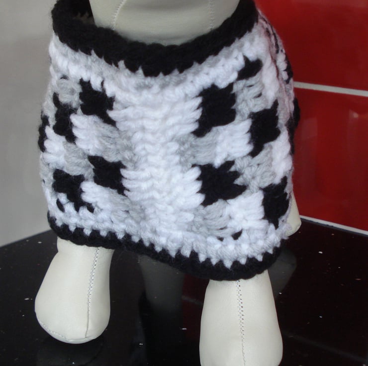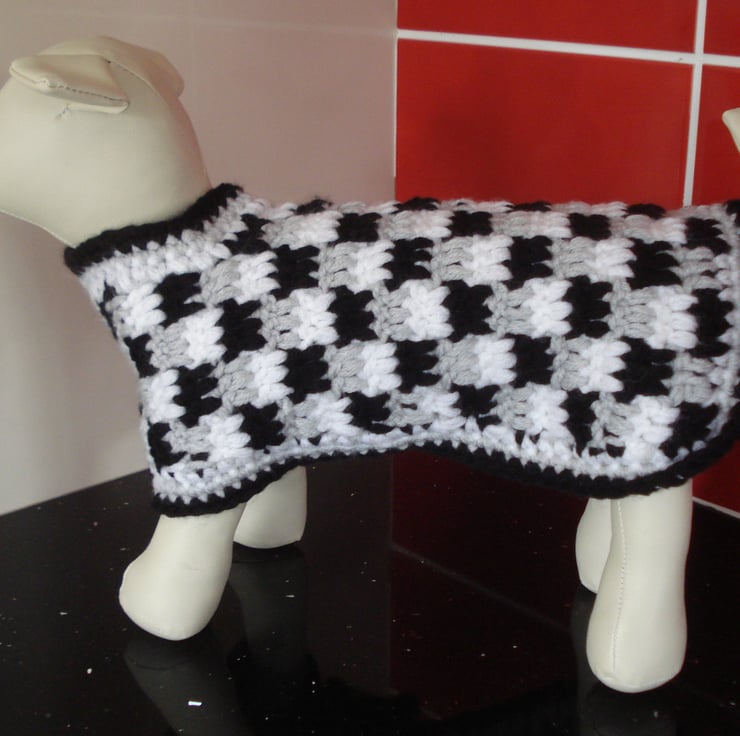 This is a crochet coat for a small dog Chihuahua or Yorkie for example. The check pattern is black, white and grey. The coat is really nice and thick just pull it over the head and fasten with a strap and button under the tummy, there are two button holes to choose from.