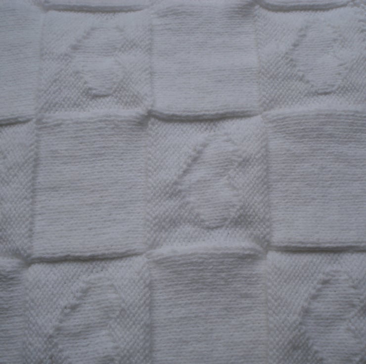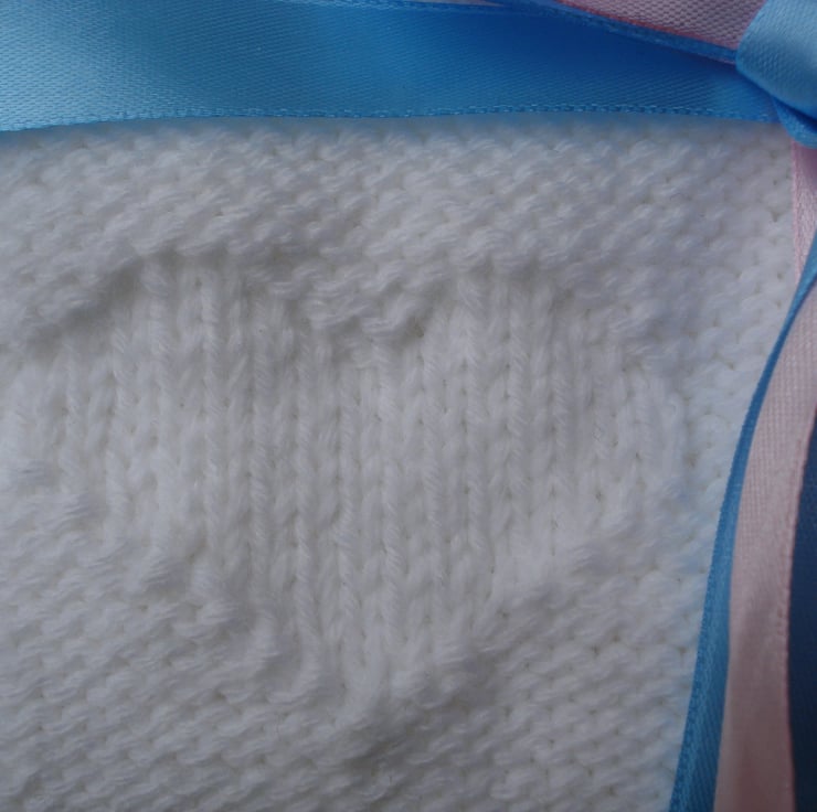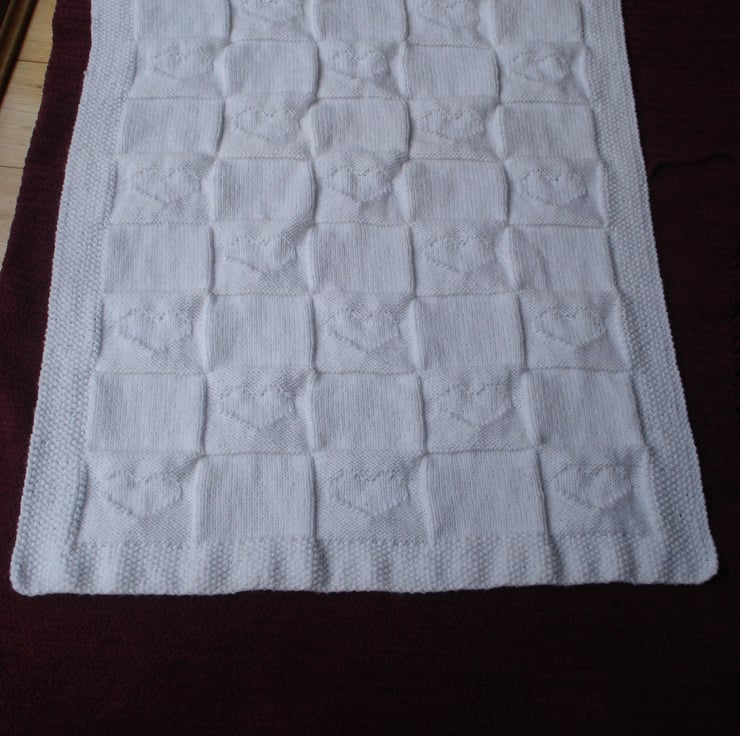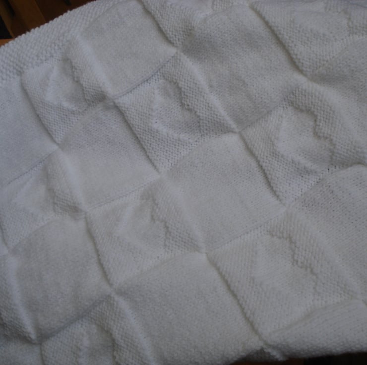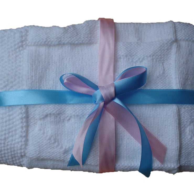 This is a lovely soft pure white blanket with mock squares which have hearts knitted into them. Comes complete with the ribbons so that it can be presented as a gift for a boy or a girl.