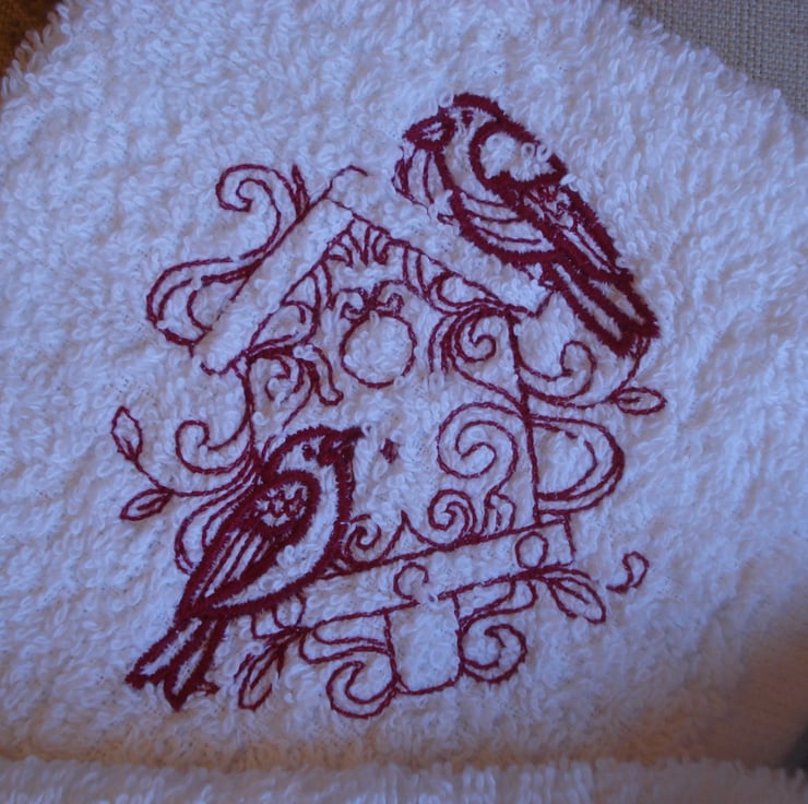 This is an embroidered hand towel and flannel. The motif is at one end of the towel and in the corner of the flannel.