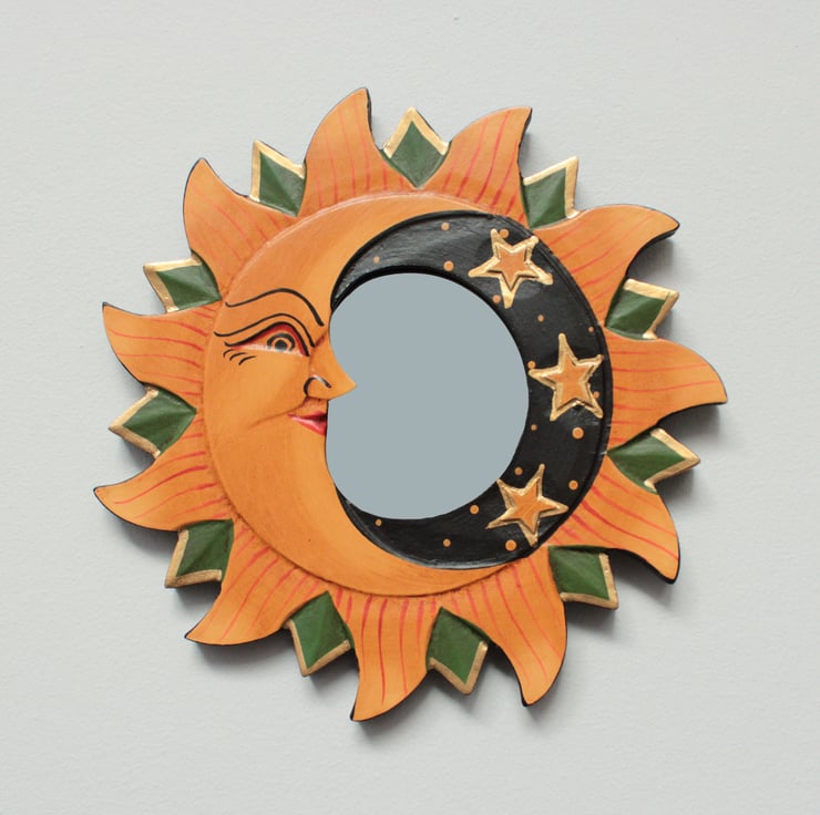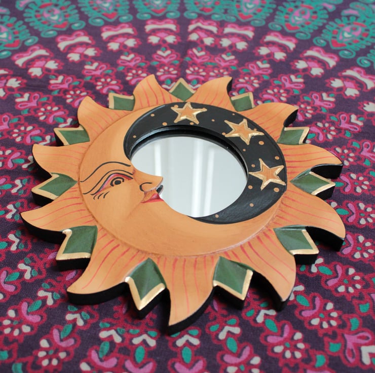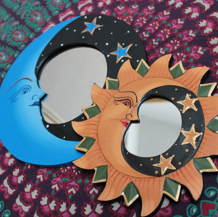 Our hand-carved, delicately painted Sun and Moon mirrors make the perfect celestial decor!