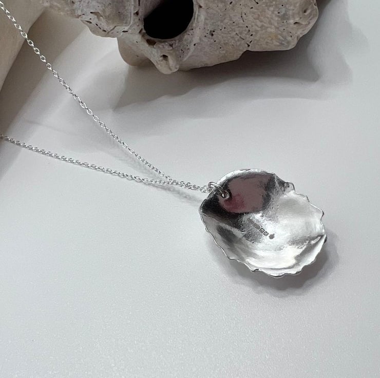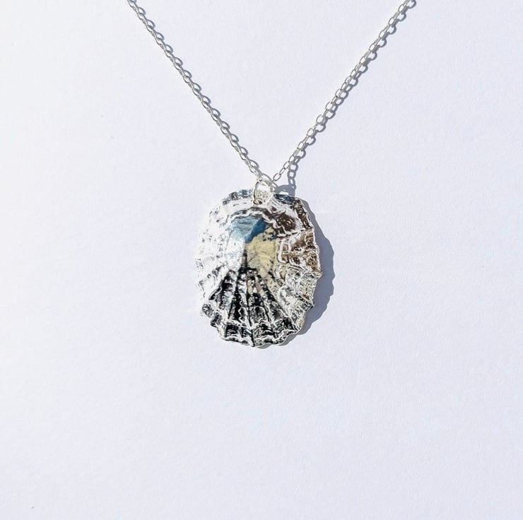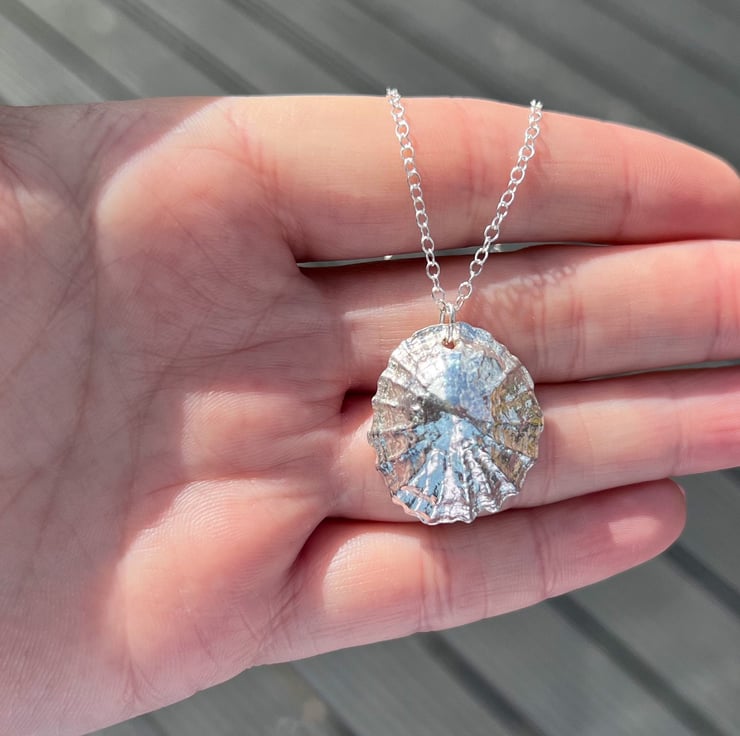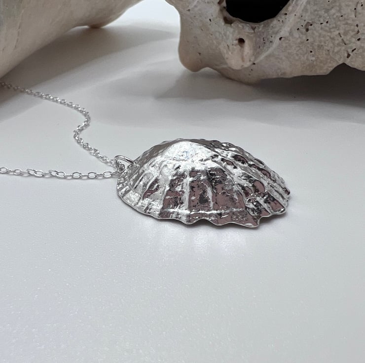Statement silver limpet shell Pendant on a delicate sterling silver trace chain. This beautiful Silver Shell Necklace is made by hand from a real shell using 999 fine silver.