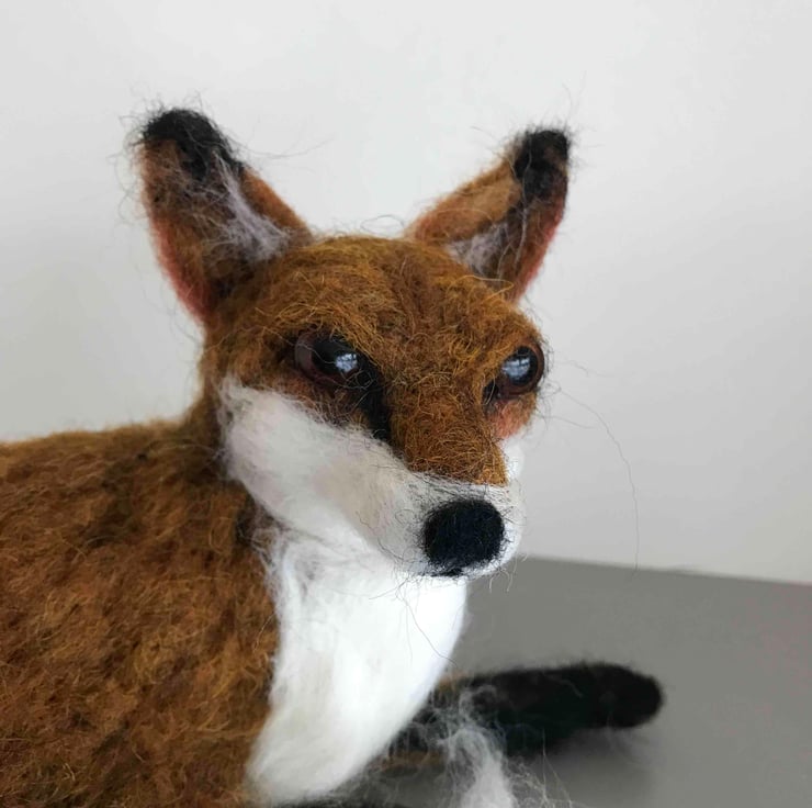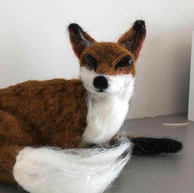 A beautiful fox lazing in the sun. Carefully felted using wool and a barbed needle. The eyes are glued in .