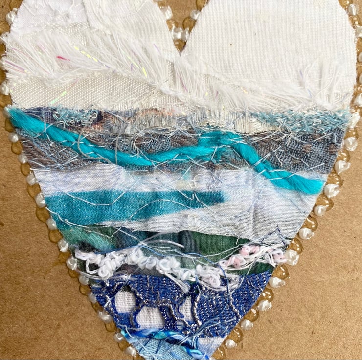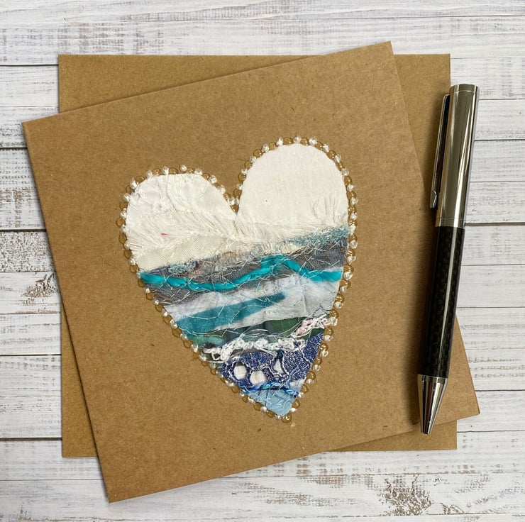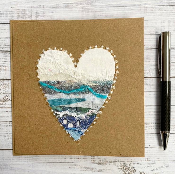 This beautiful embroidered heart has been made with my own handmade up-cycled fabric. Its been made from threads, fibres, cottons and enhanced with free motion embroidery. It’s framed with 3-D dots and backed with patterned card. It’s perfect for a wedding, anniversary, engagement, Valentines or for someone very special. It’s framed with 3-D dots. It is blank inside making it ideal for any occasion. This brown card measures 14.5 x 14.5cm, comes with an envelop and in a plastic cover for protection.
