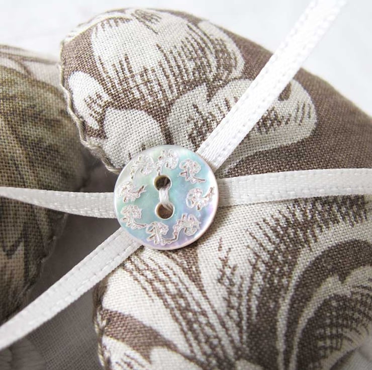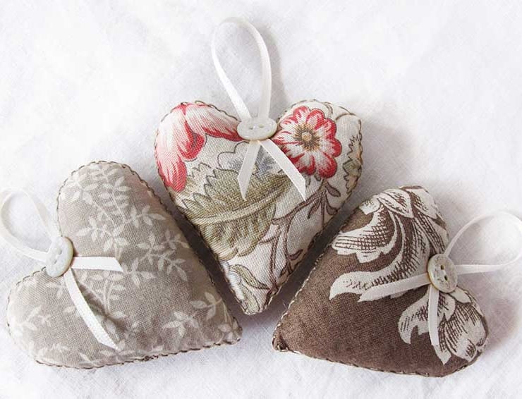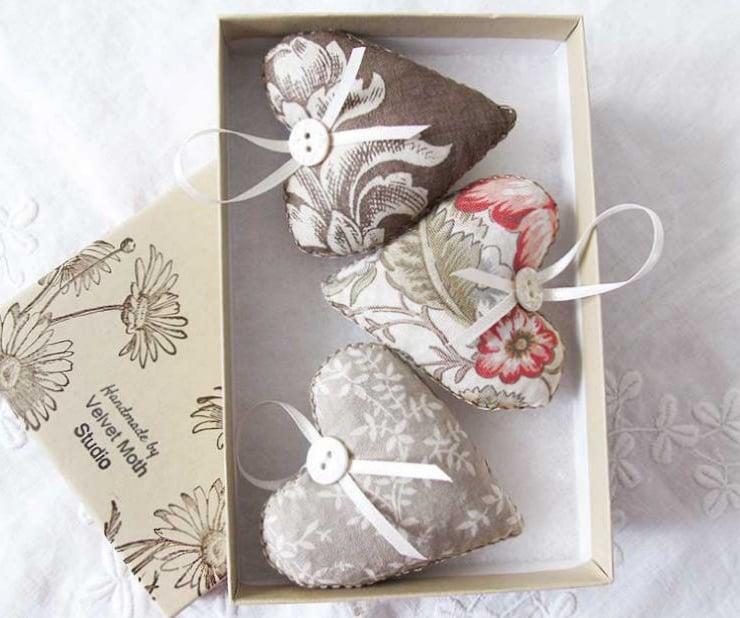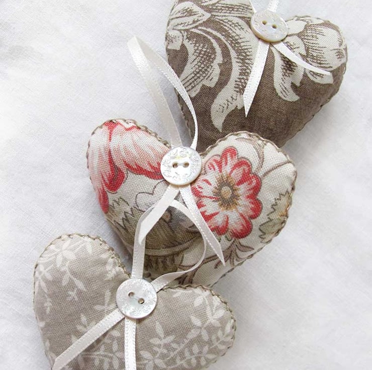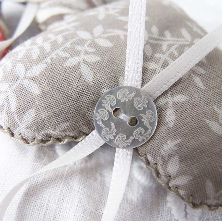 A very pretty little set of three lavender bags - hand made, filled with beautiful scented lavender and then finished with hand embroidery, co-ordinating ribbon and engraved shell buttons. The hearts measure 6cm wide x 6.5cm long (not including the ribbon) and are made in co-ordinating shades of taupe, cream and red fabrics.