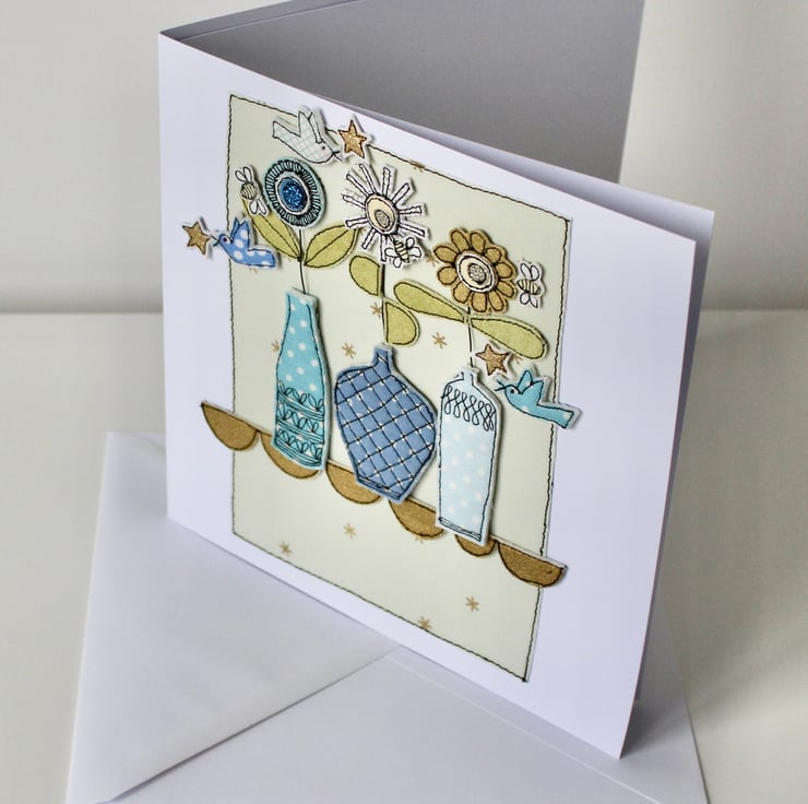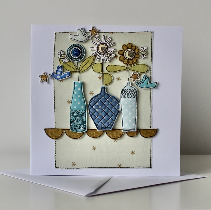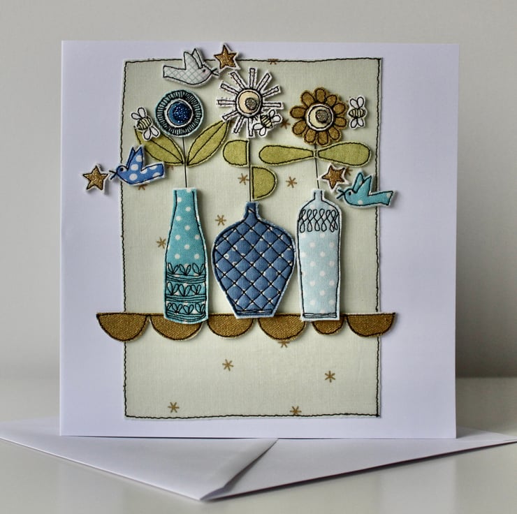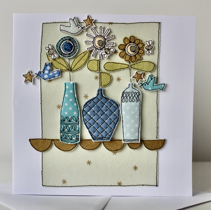 This card has been sewn by me and my sewing machine, using cotton cloth and metallic fabric; making it totally unique.