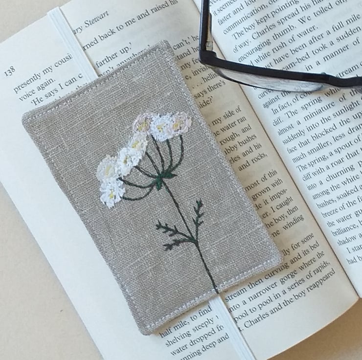 A really practical bookmark made from linen with an elastic band to go round your book and keep the page. It has an embroidered sprig of cow parsley made by using free motion embroidery over appliqued fabric.