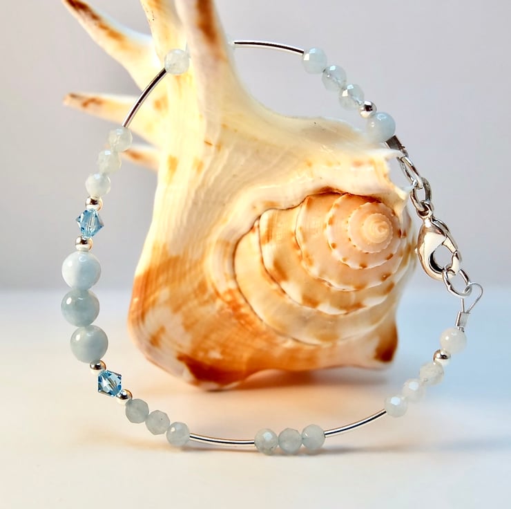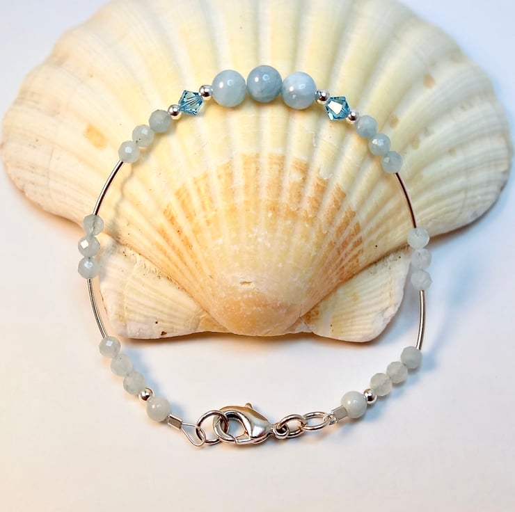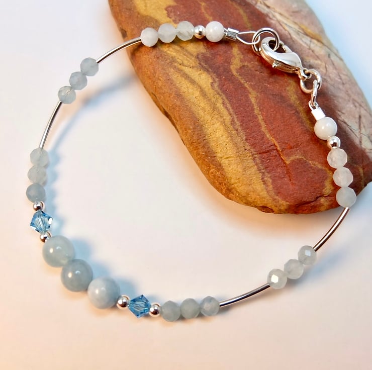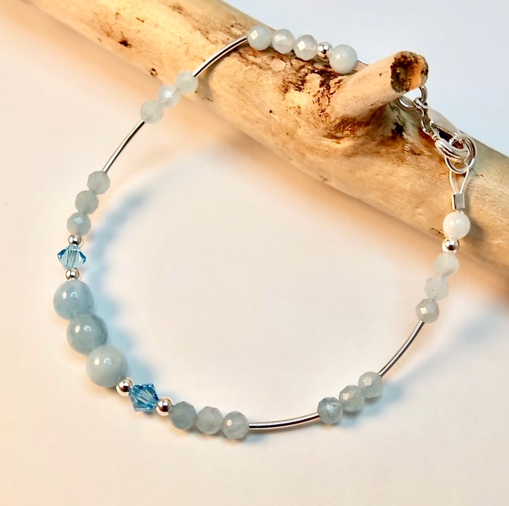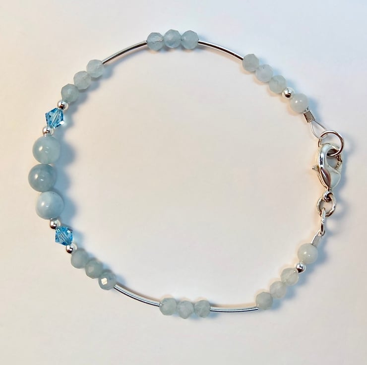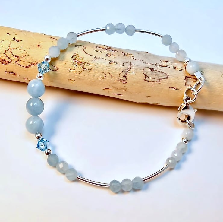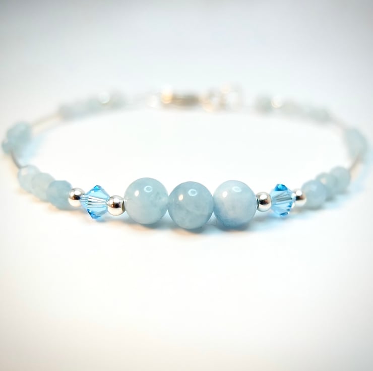 Dainty blue and silver bracelet made from genuine Aquamarine beads and sterling silver, with a pair of sparkly Swarovski crystals in 'aquamarine' blue.